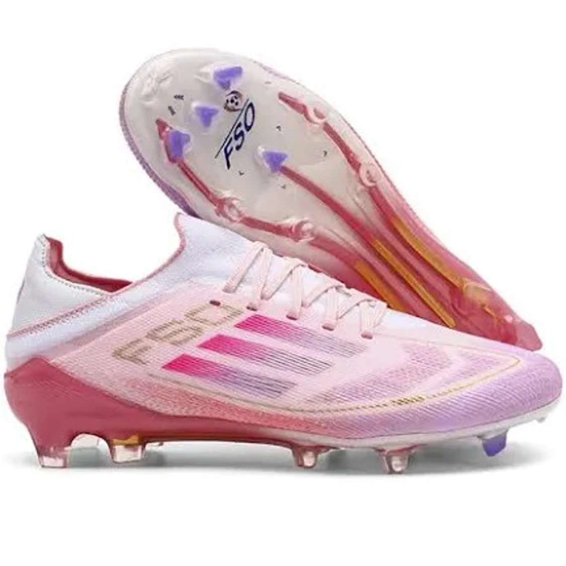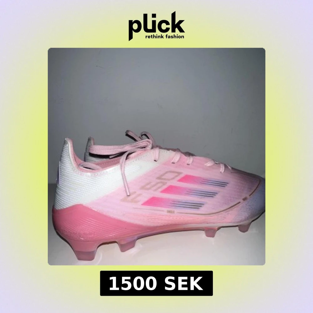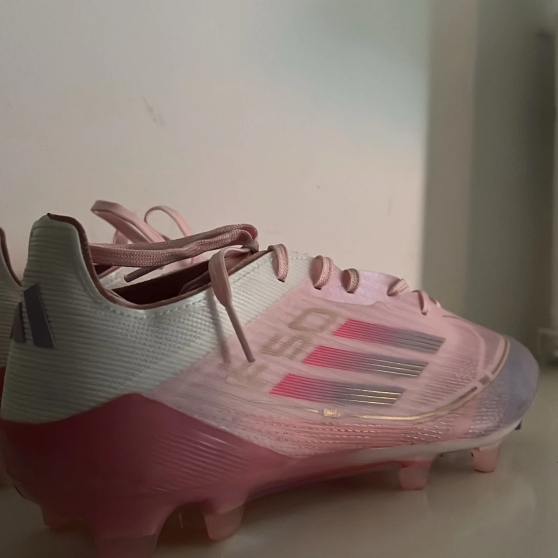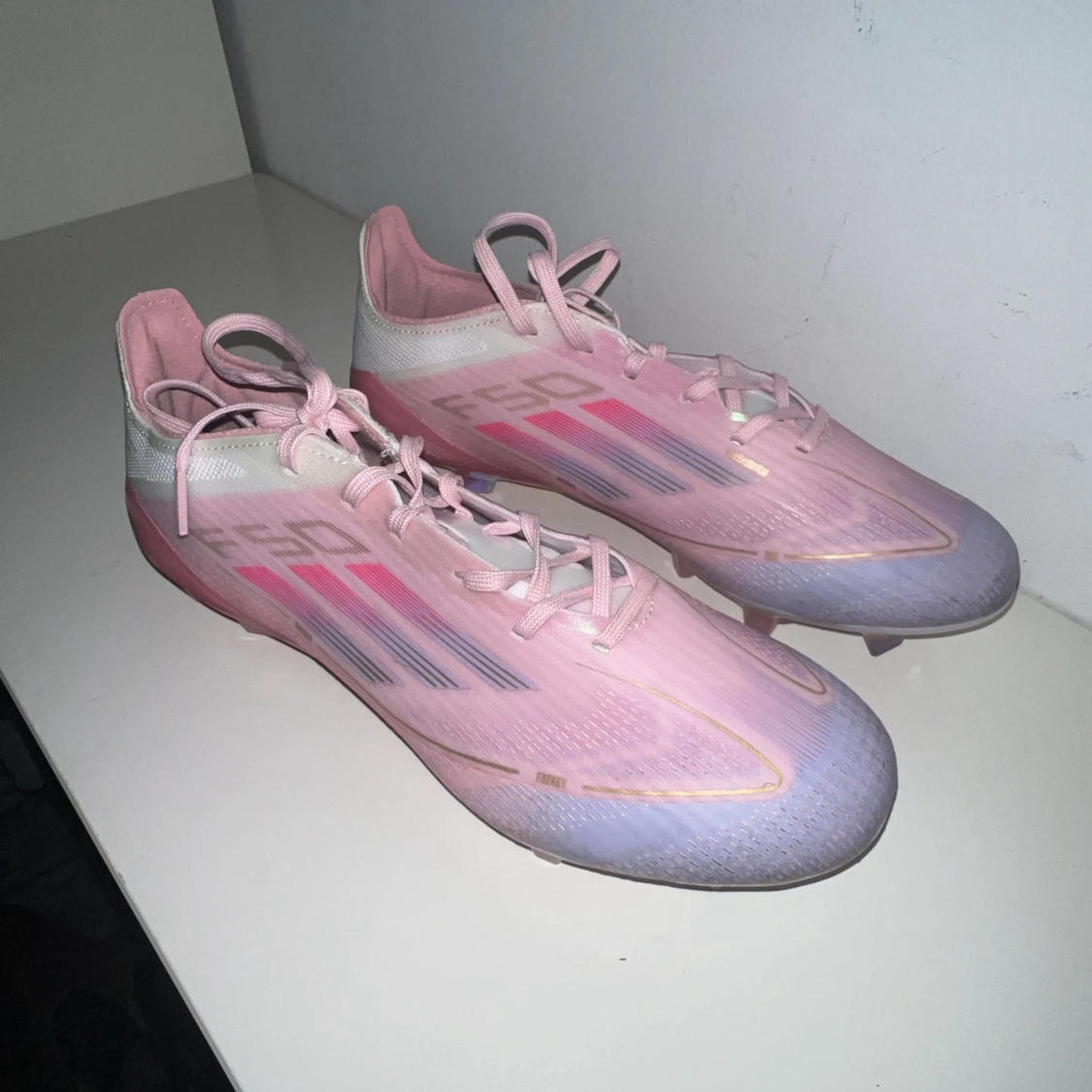 Säljer ett par Adidas FSO fotbollsskor i en snygg rosa och vit färg med lila detaljer. Skorna har snörning och en platt sula med dobbar i iriserande finish. Ovandelen är tillverkad i syntetmaterial och har de klassiska tre ränderna i rosa och blått på sidan. Perfekt för dig som vill sticka ut på planen.