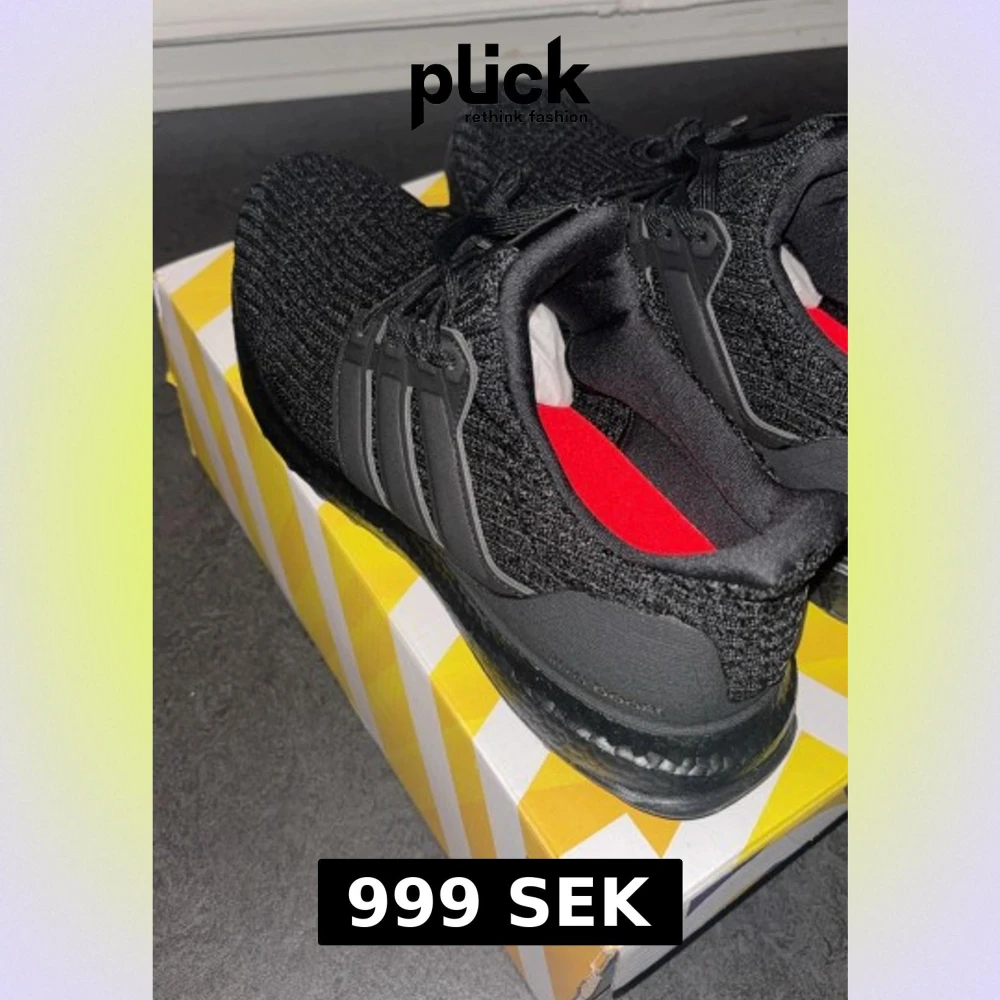 Säljer ett helt nytt par svarta Adidas Ultraboost sneakers med stickad ovandel och klassiska tre ränder på sidan. Skorna har svart sula, snörning och röd innersula med Primeblue-tryck. Perfekta för dig som gillar stilrena och bekväma sneakers i syntetmaterial.