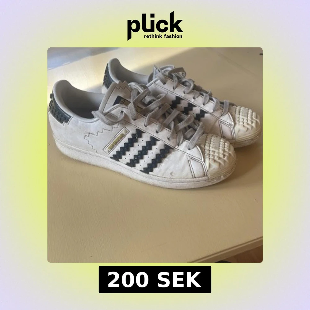 Unika Adidas Superstar sneakers i samarbete med LEGO. Skorna är vita med svarta detaljer och har LEGO-inspirerade mönster på tå, häl och sidor. Klassisk snörning och platt sula. Tillverkade i skinn med coola zigzag-detaljer och tydlig LEGO branding.