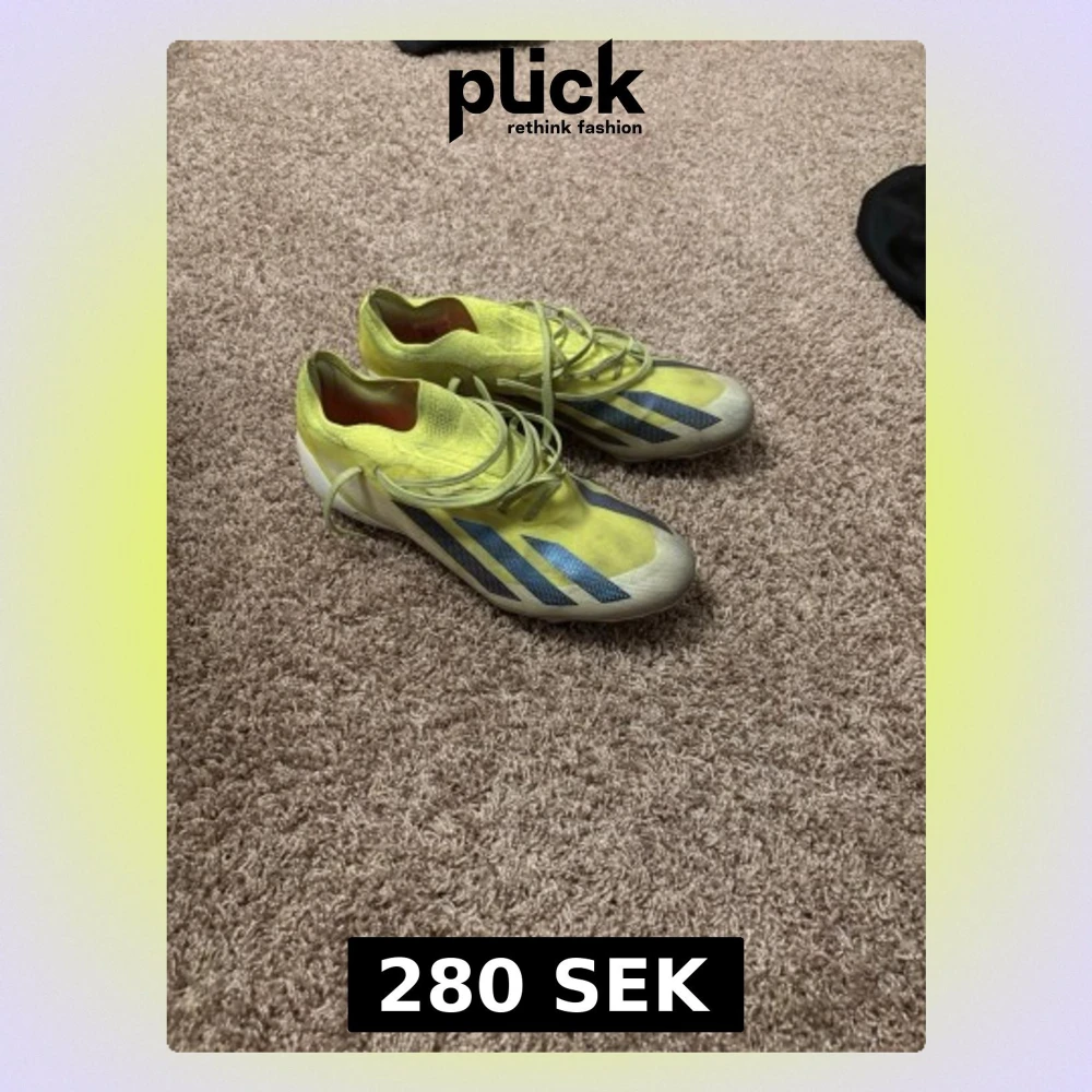 Säljer ett par Adidas Crazyfast fotbollsskor i en fräsch gul färg med blå ränder och vita detaljer. Skorna har snörning och en lätt ovandel i syntetmaterial samt dobbar för gräsplan. Perfekta för dig som vill sticka ut på planen.