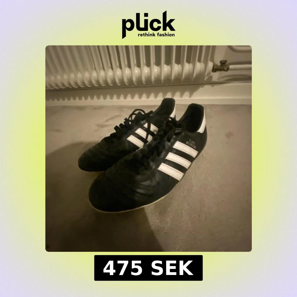 Klassiska Adidas Copa Mundial fotbollsskor i svart läder med vita detaljer och de ikoniska tre ränderna på sidorna. Skorna har snörning och rund tå, samt dobbar för gräsplan. Perfekta för dig som vill ha stilrena och tidlösa fotbollsskor. De är använda en halv fotbollssäsong och blivit lite gula på sulan och är lite slitna men det är inga större fel på de.