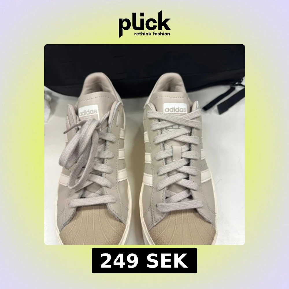 Snygga beige adidas Superstar sneakers med klassiska vita ränder och tåskydd i gummi. Skorna har snörning och en platt sula, perfekt för en avslappnad och trendig look. Ikonisk adidas-logga på plösen och sidan.