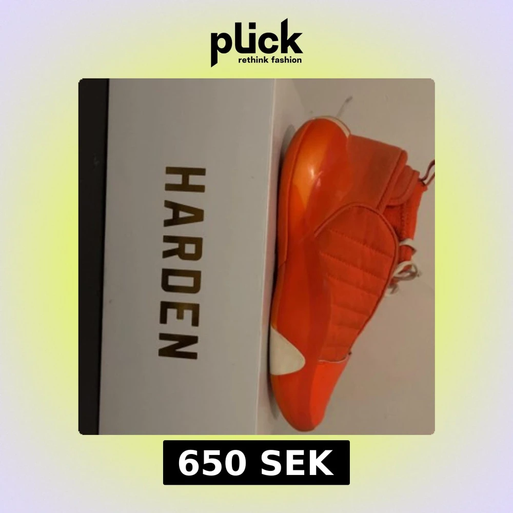 Säljer ett par Adidas Harden sneakers i en riktigt fet orange färg med vita detaljer. Skorna har snörning och en platt sula med mönstrad undersida för extra grepp. Ovandelen är tillverkad i syntet och textil, perfekt för dig som gillar basketstil och sportig vibe.