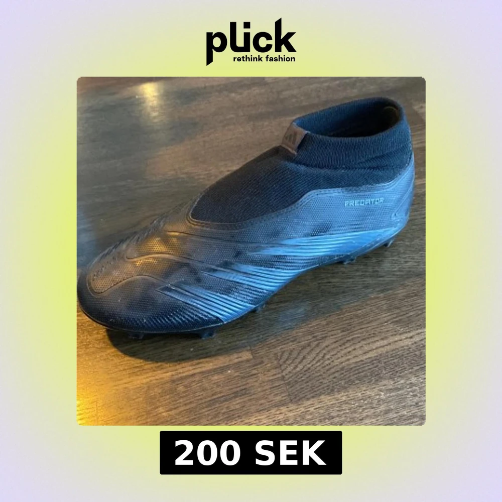 Säljer ett par svarta Adidas Predator fotbollsskor. Skorna har en strumpliknande passform utan snörning och är designade för att ge bra grepp på planen. Perfekta för den seriösa fotbollsspelaren som vill ha kontroll och precision.