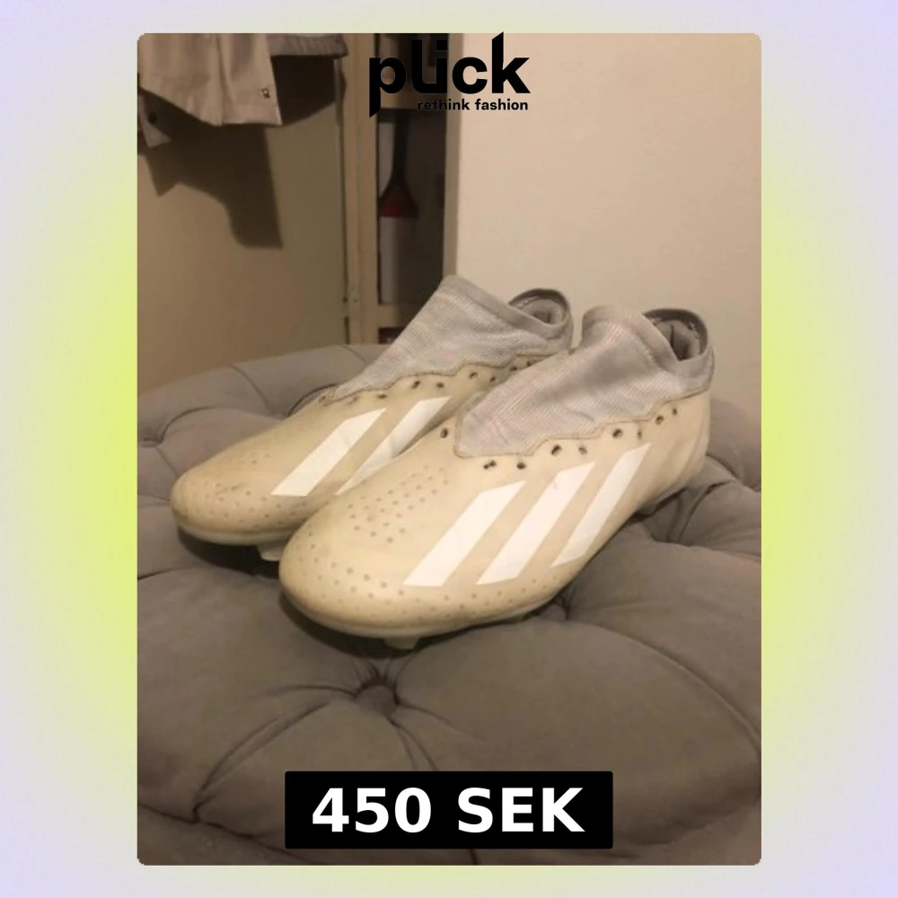 Säljer ett par Adidas Crazyfast fotbollsskor i vitt med klassiska tre ränder på sidan. Skorna har en strumpliknande grå ovandel och platt sula med dobbar för gräsplan. Tillverkade i syntetmaterial för lätt känsla och bra passform. Perfekta för dig som vill ha speed på planen. Finns inge skosnöre på båda skor!