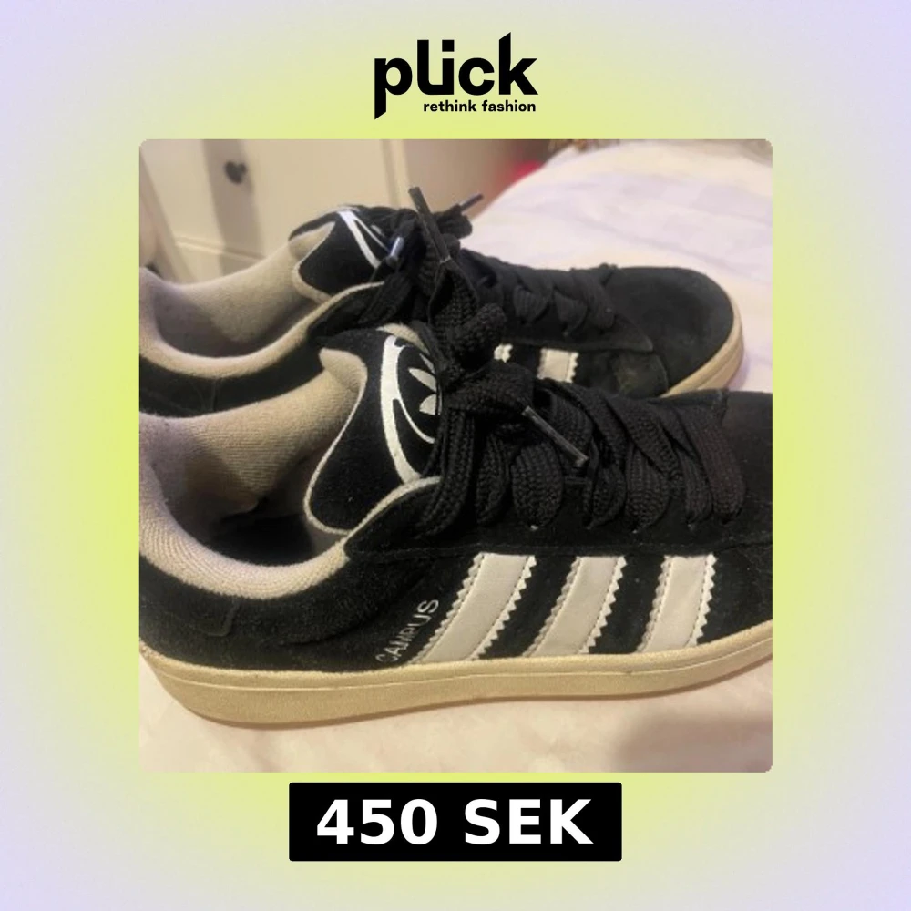 Adidas Campus sneakers i svart mocka med vita detaljer och klassiska tre ränder på sidan. Skorna har rund tå, platt sula och snörning. Adidas logga på plösen och hälen. Stilren och tidlös modell som funkar till många olika outfits.