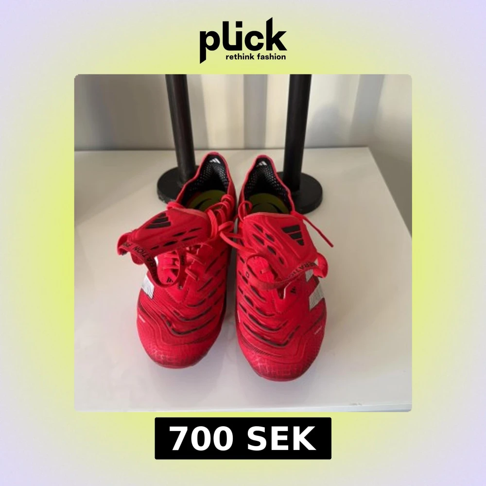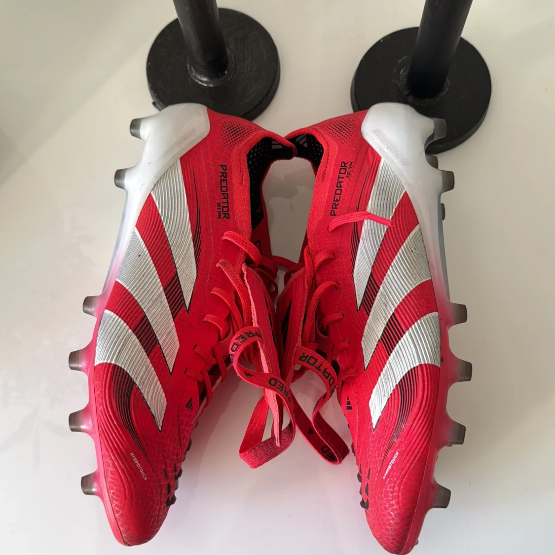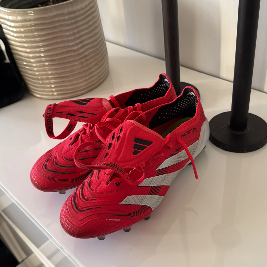 Säljer ett par röda Adidas Predator fotbollsskor med vita och svarta detaljer. Skorna har snörning, klassiska tre ränder på sidan och en modern, sportig design. Ovandelen är i syntetmaterial och sulan har fasta dobbar för spel på gräs. Perfekta för dig som vill sticka ut på planen. Säljer dessa skor använda max 10 gånger fungerar helt fel fritt