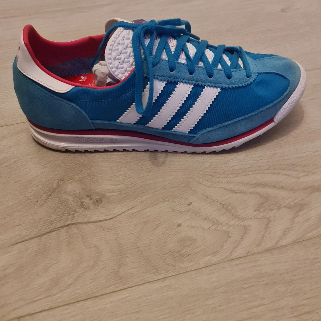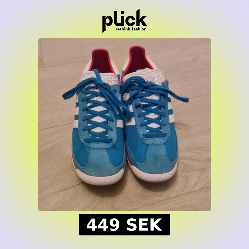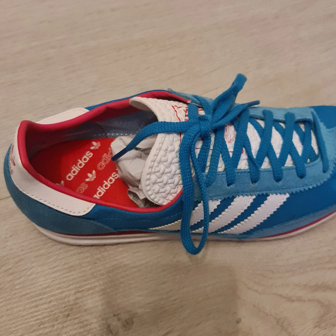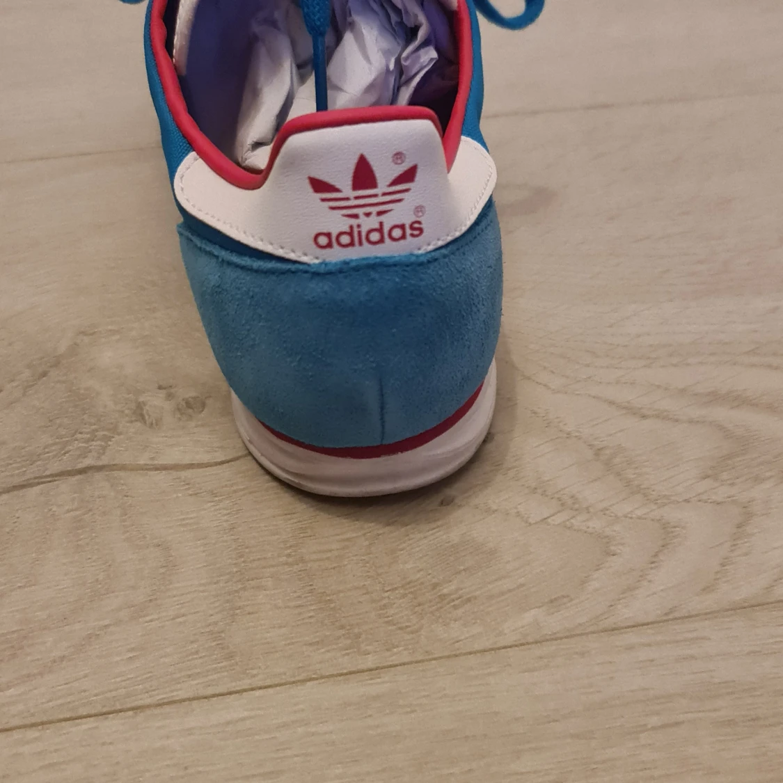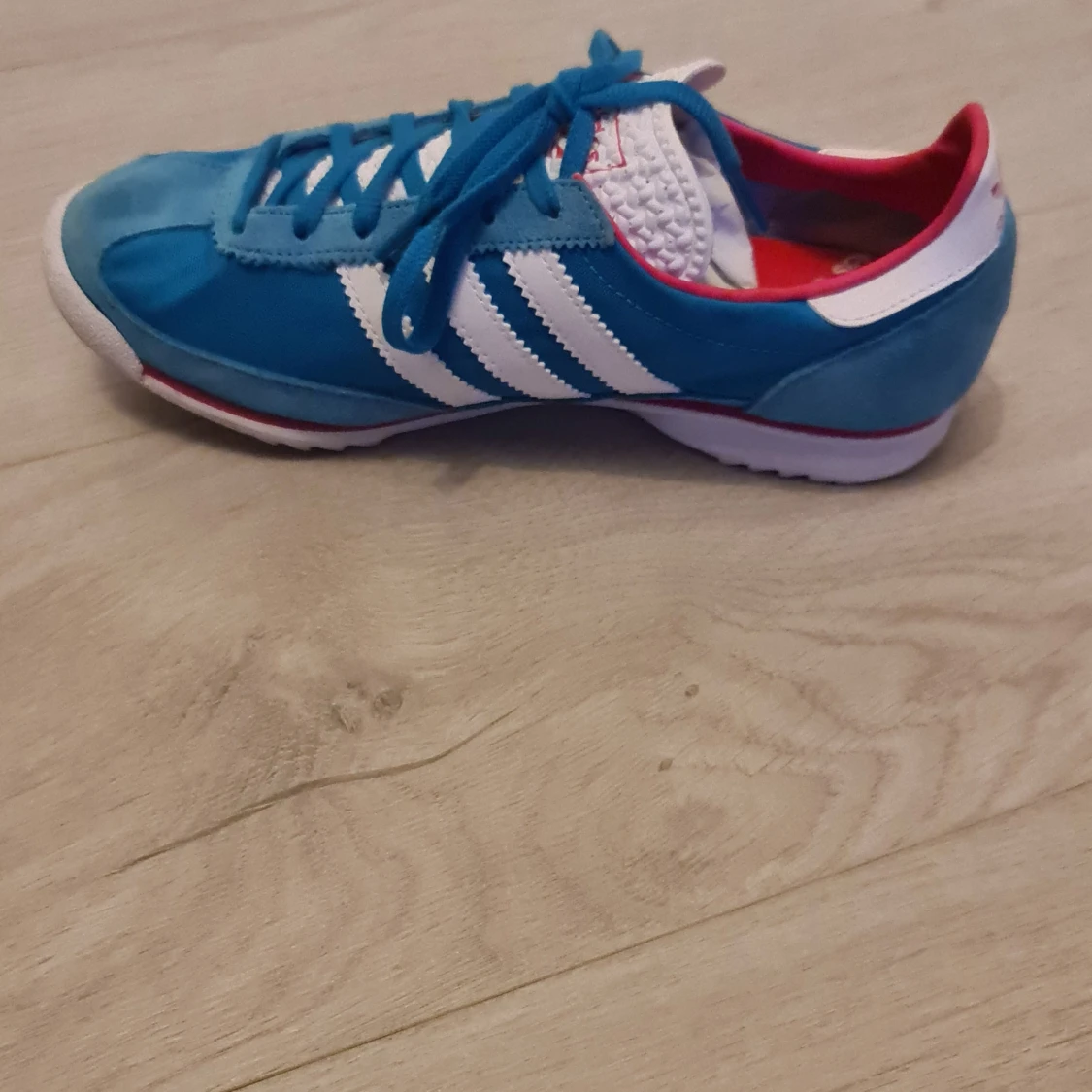 Snygga blå Adidas sneakers med klassiska vita ränder på sidorna och detaljer i rött. Ovandelen är i mocka och textil, med vit plös och snörning. Skorna har låg profil och platt sula, perfekt för en sportig och retro look.