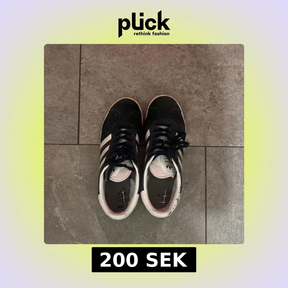 Säljer ett par klassiska Adidas Gazelle sneakers i marinblå mocka med vita detaljer och snörning. Skorna har de ikoniska tre ränderna på sidan, rund tå och platt sula med mönstrad undersida. Perfekt för dig som gillar retrostil och streetwear.