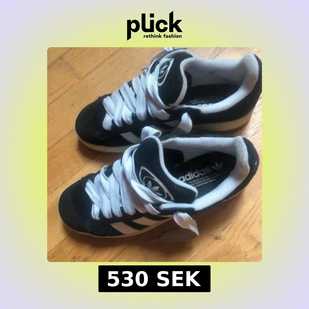 Svarta Adidas Campus sneakers i mocka med klassiska vita ränder och vit sula. Skorna har rund tå, platt gummisula och vita snören. Perfekta för dig som gillar retrostil och streetwear. Adidas-logga på plösen och sidan.