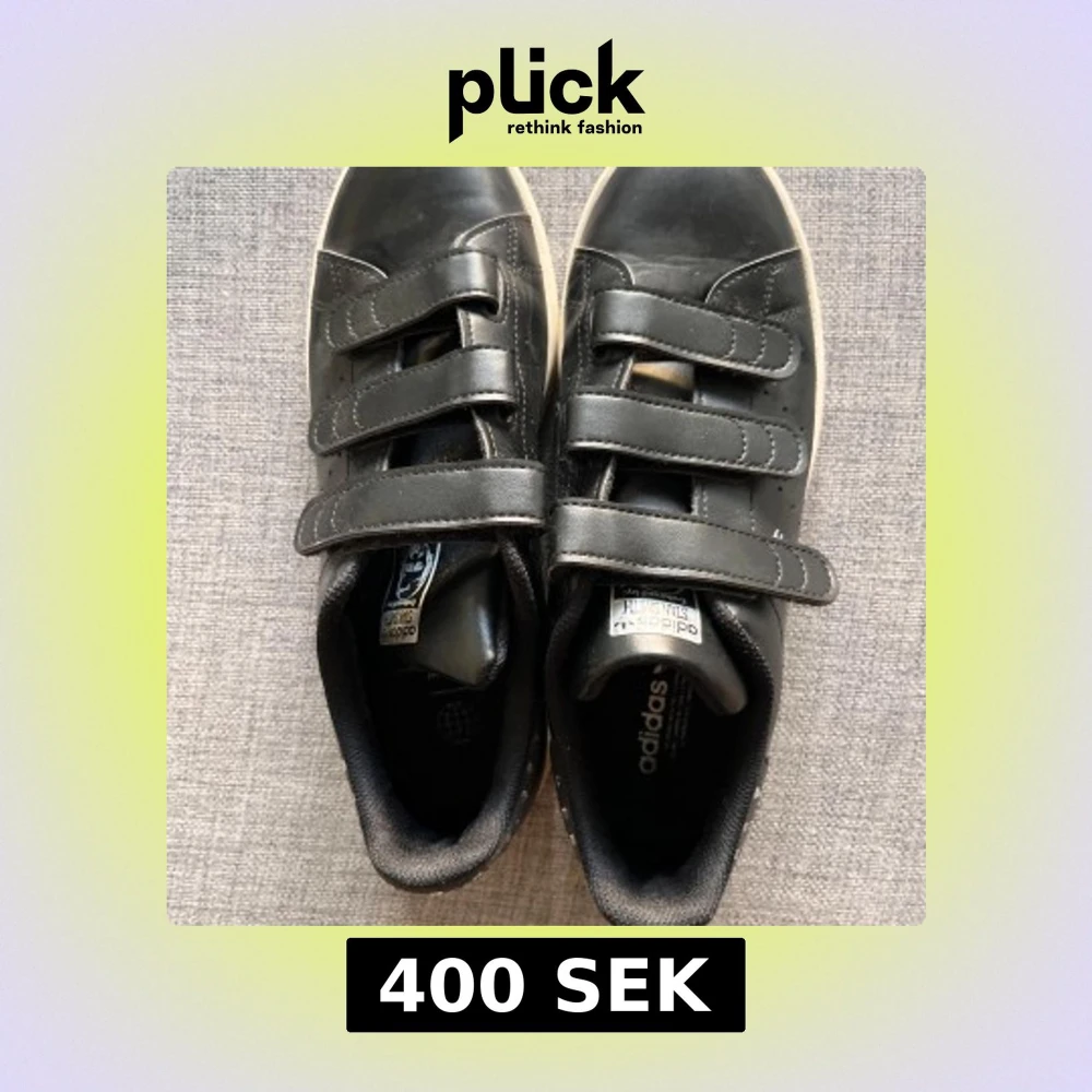 Snygga svarta Adidas Stan Smith sneakers med praktiska kardborreband och glittrande detaljer på hälen. Perfekta för en stilren look med en twist. Sulan är vit och ger en klassisk kontrast till det svarta lädret. Som nya!