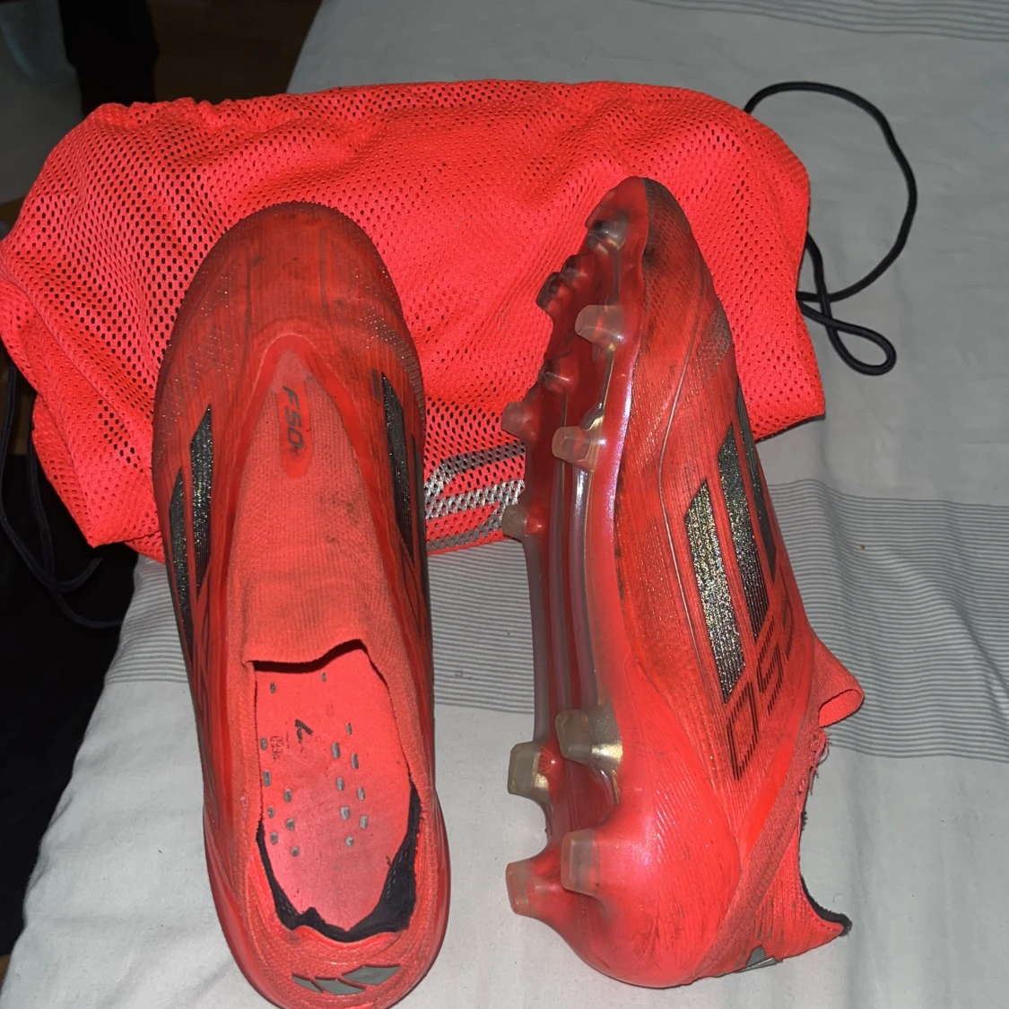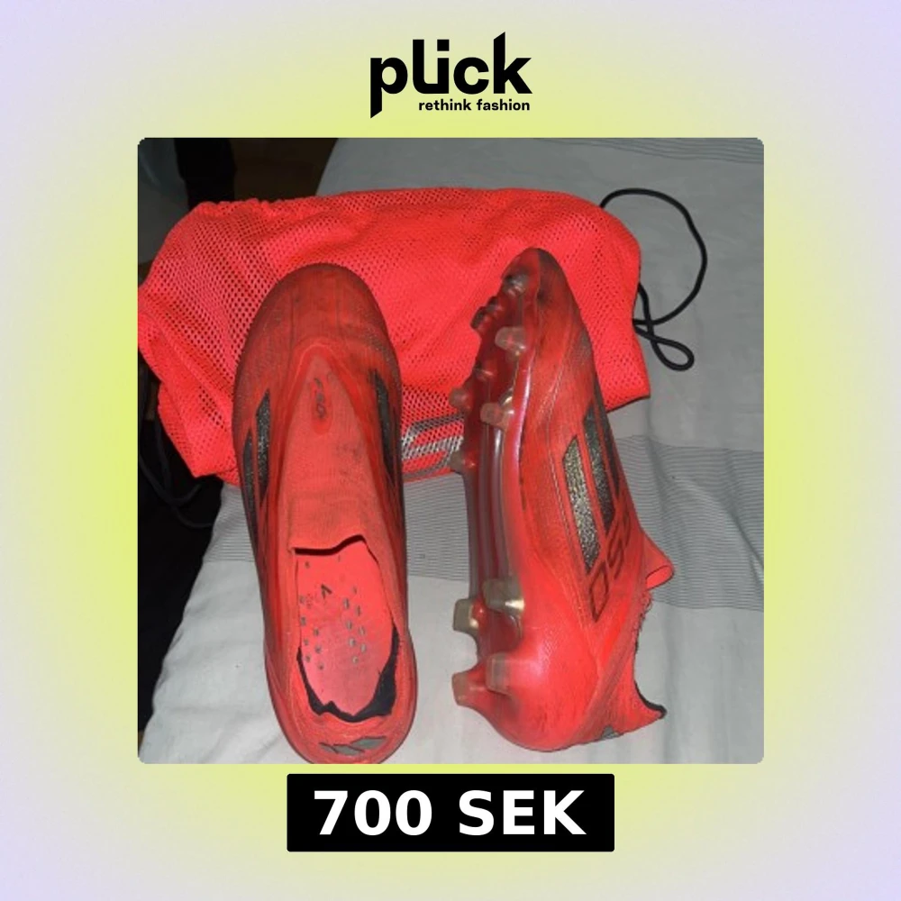 Säljer ett par röda fotbollsskor från Adidas med svarta detaljer och dobbar för gräsplan. Jätte sköna men använd ett tag nu men inga konstigheter vid strumpan som har gått upp lite