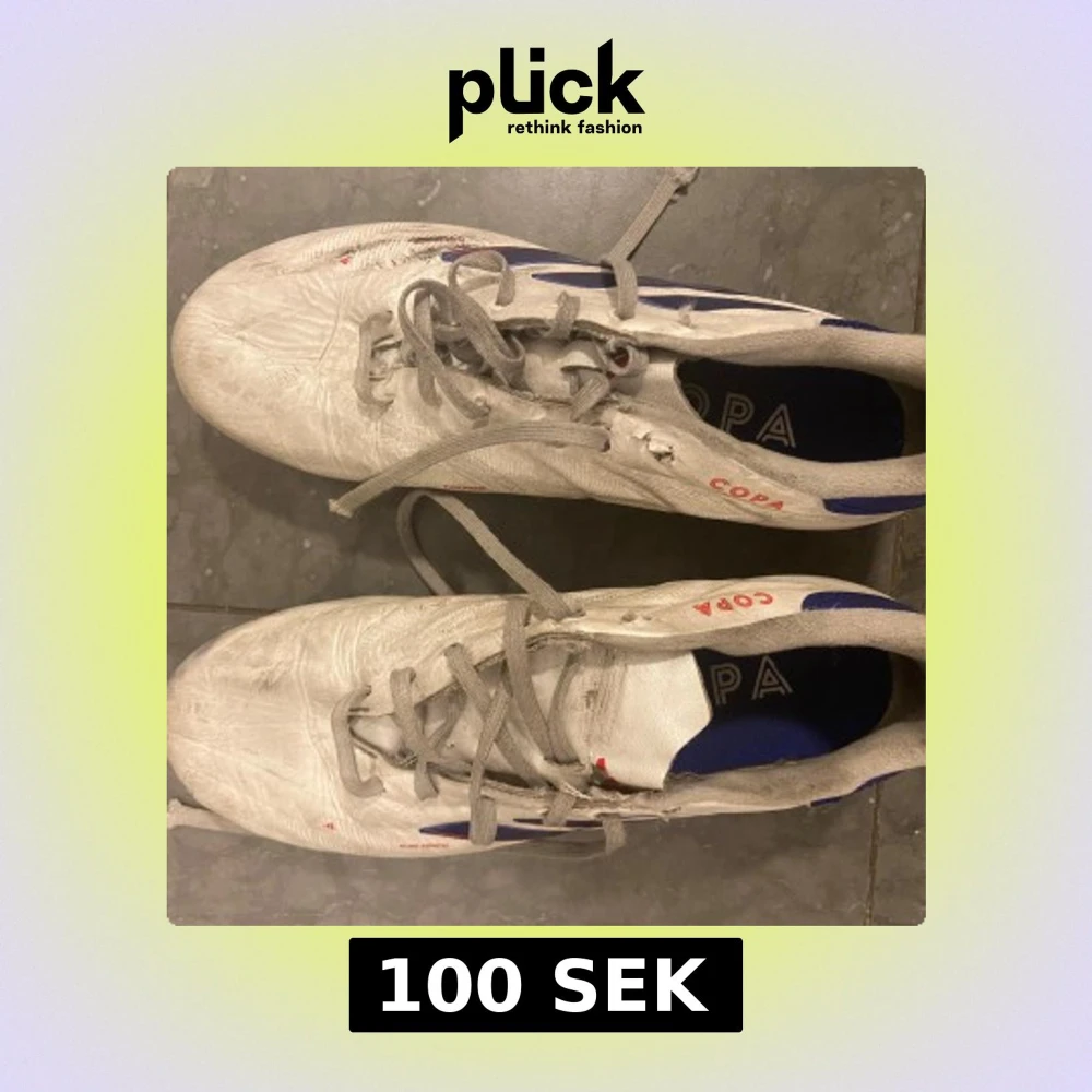 Adidas Copa fotbollsskor i vitt med blå och röda detaljer. Skorna har snörning och en platt sula med fasta dobbar i svart och rött. Ovandelen är i skinn och insidan har blå textil med Copa-tryck. Perfekt för dig som vill ha klassiska och snygga fotbollsskor.