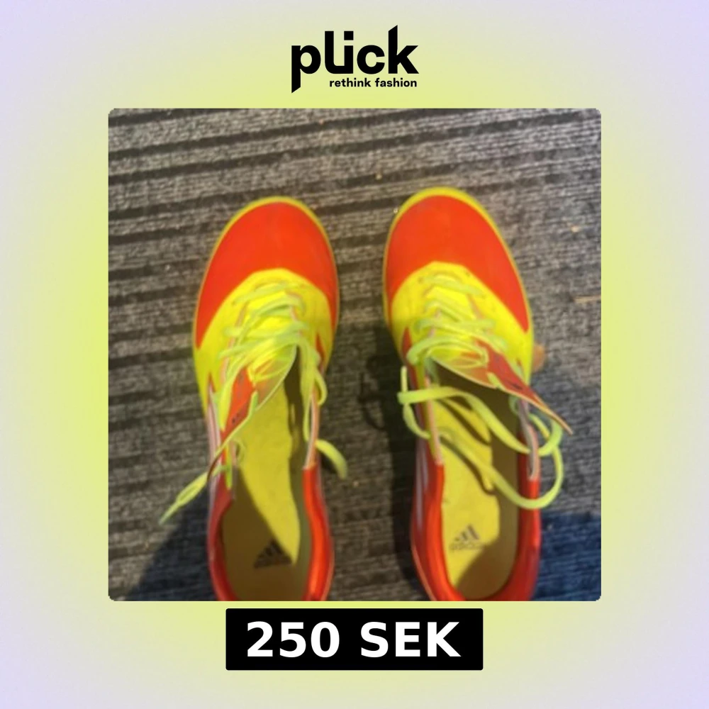 Säljer ett par Adidas fotbollsskor i riktigt snygg neon-gul och röd färg med vita ränder på sidorna. Skorna har snörning och dobbar för gräsplan. Perfekta för dig som vill sticka ut på planen och få bra grepp när du spelar. Sköna dojor att lirka runt i under spontanfotboll