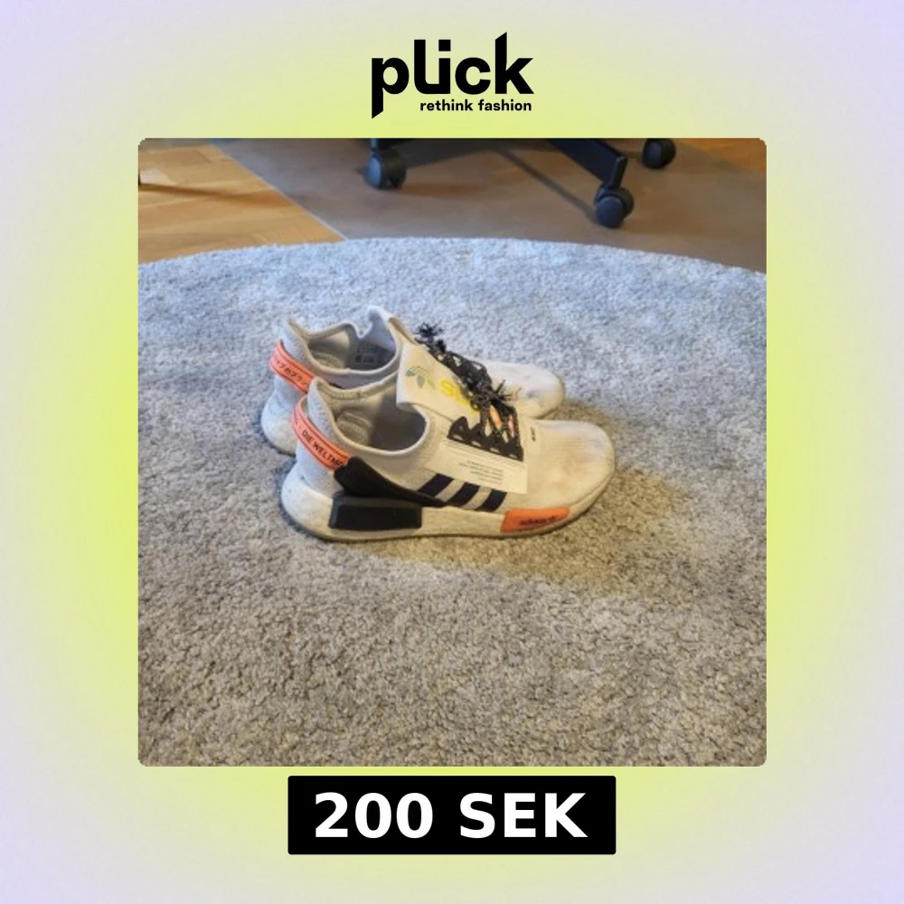 Säljer ett par Adidas NMD sneakers i vitt med svarta och orange detaljer. Ja tvättar skorna ordentligt innan frakt!