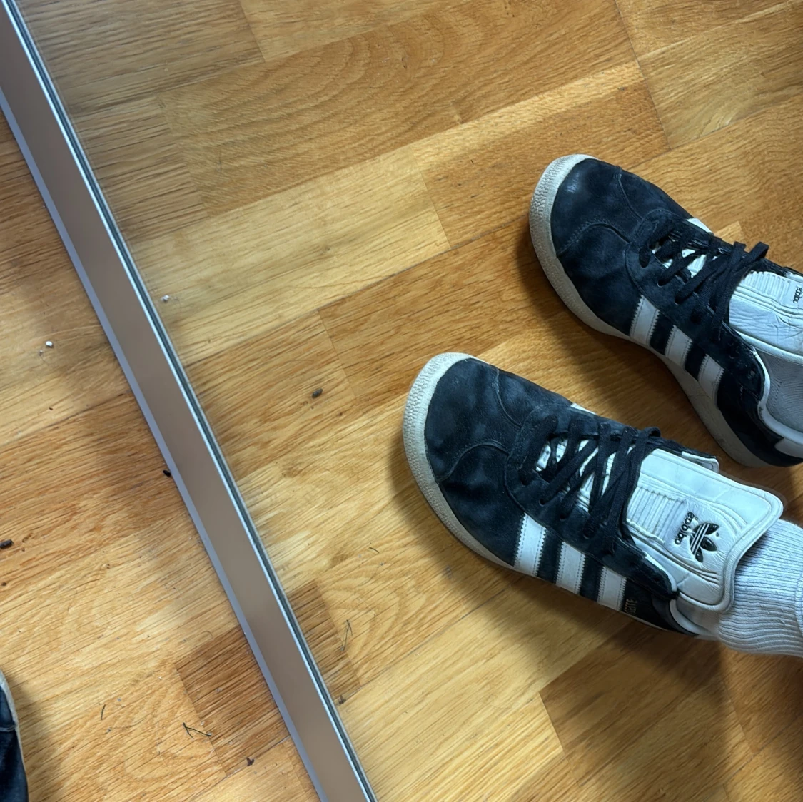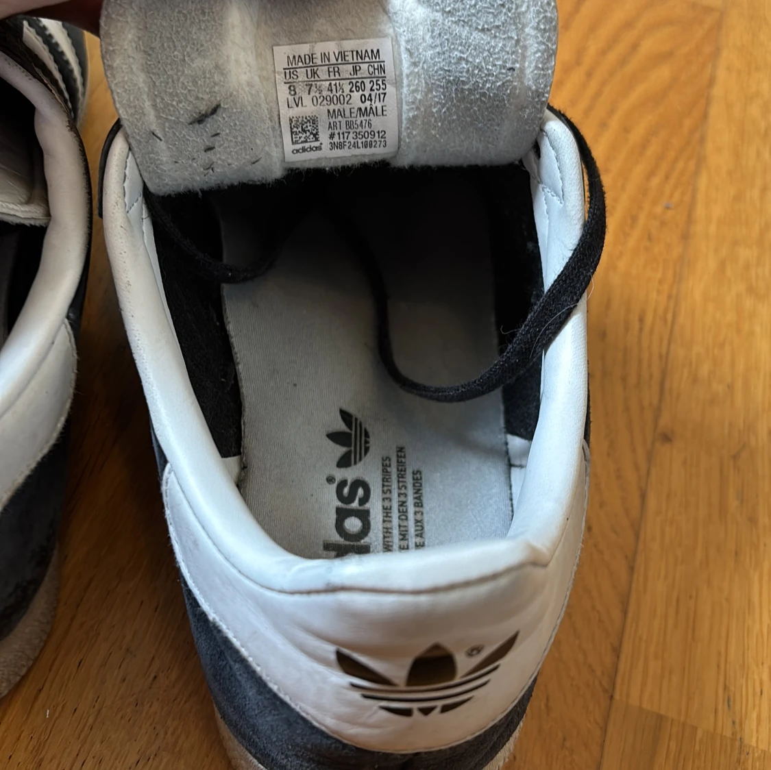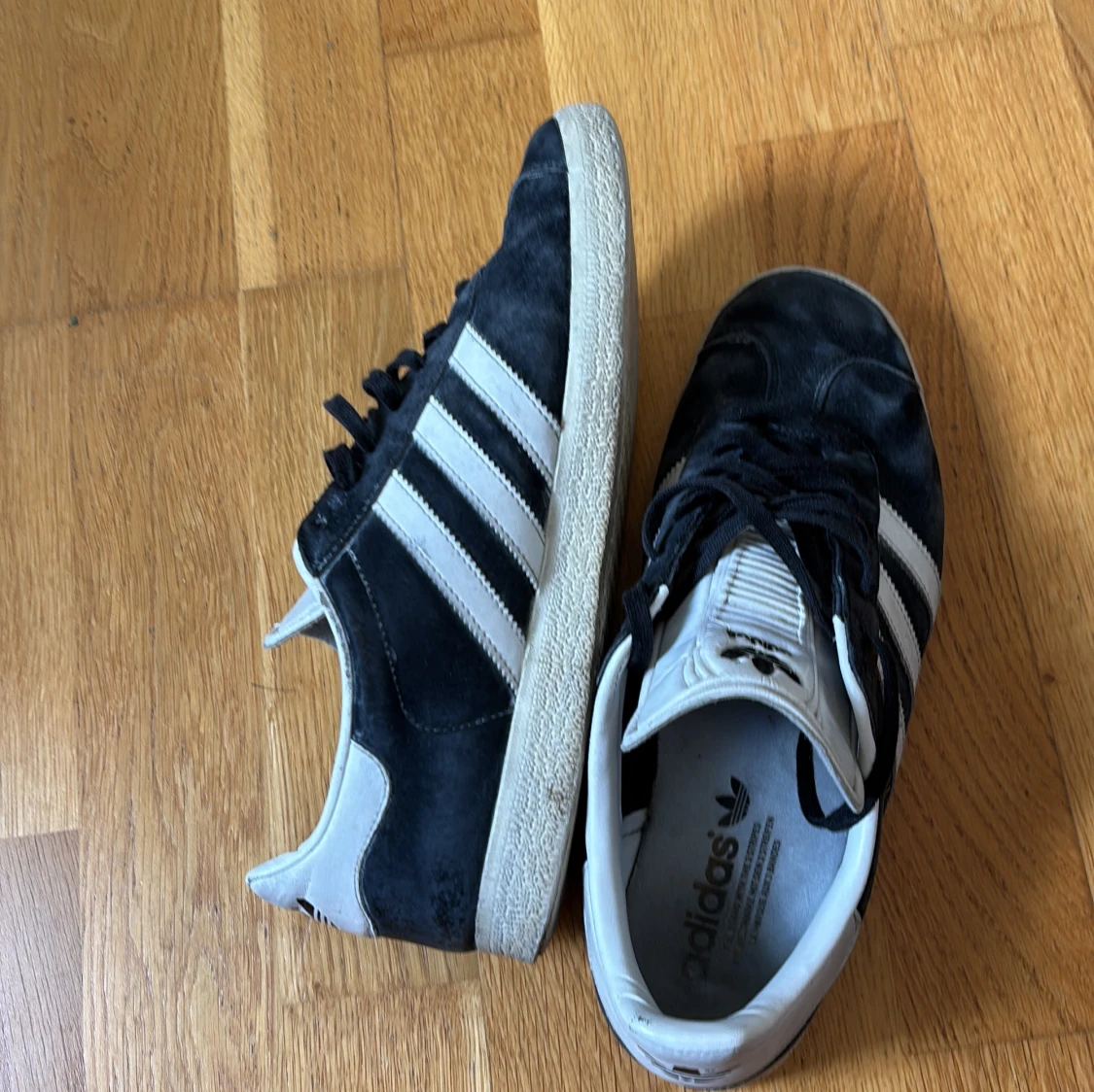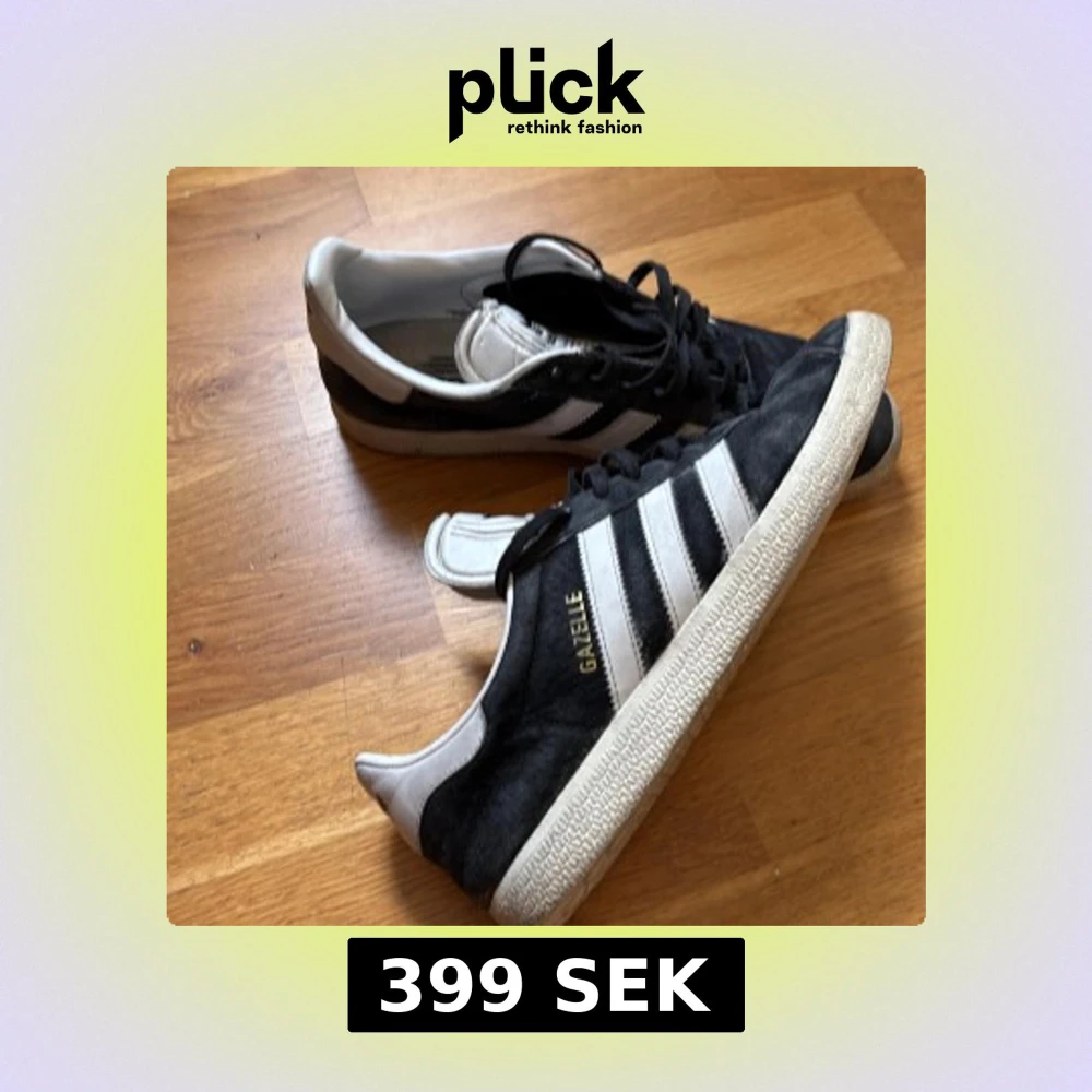 Storlkek 41 ganska dåligt skick därför endast 399kr. Skorna har platt sula, rund tå och snörning. Guldtexten 'GAZELLE' på sidan och vit hälkappa med Adidas-logga. Perfekta för en clean och sportig stil. Skriv vid minsta fundering.