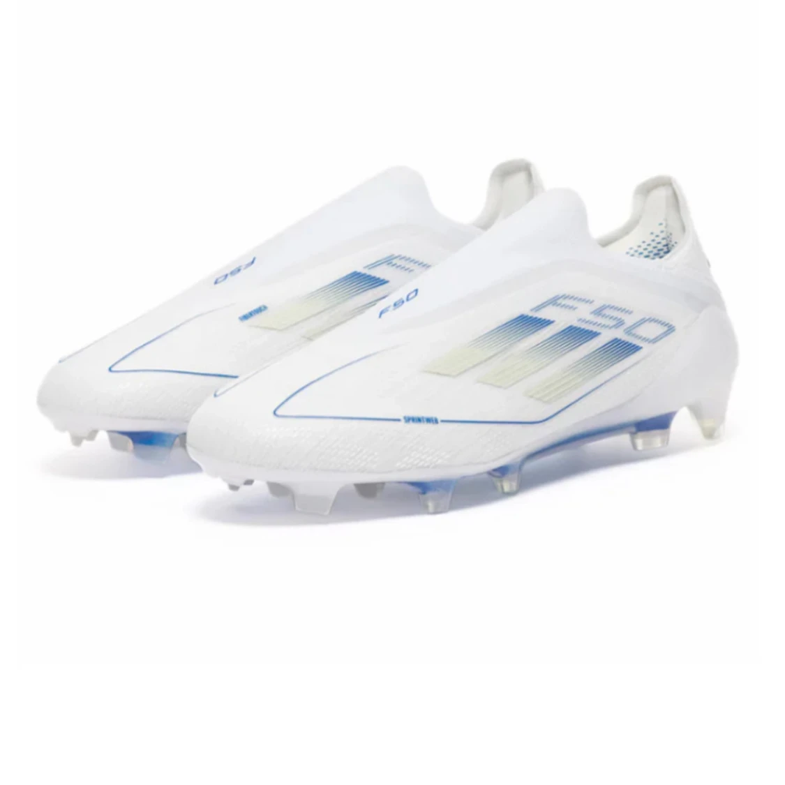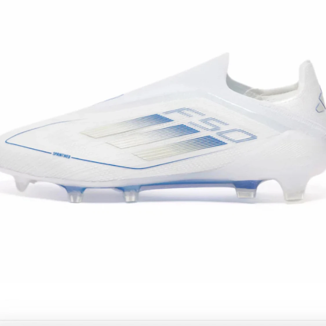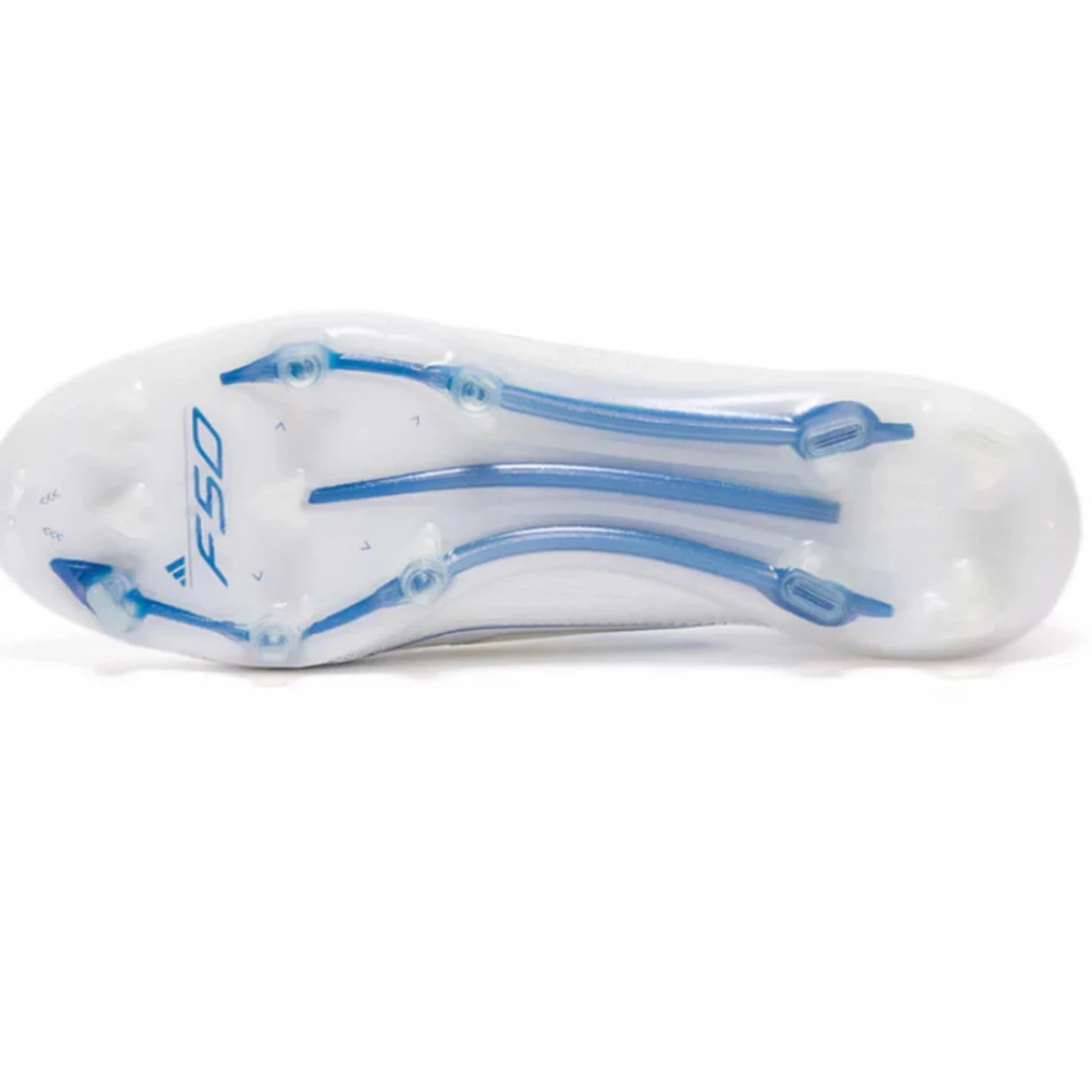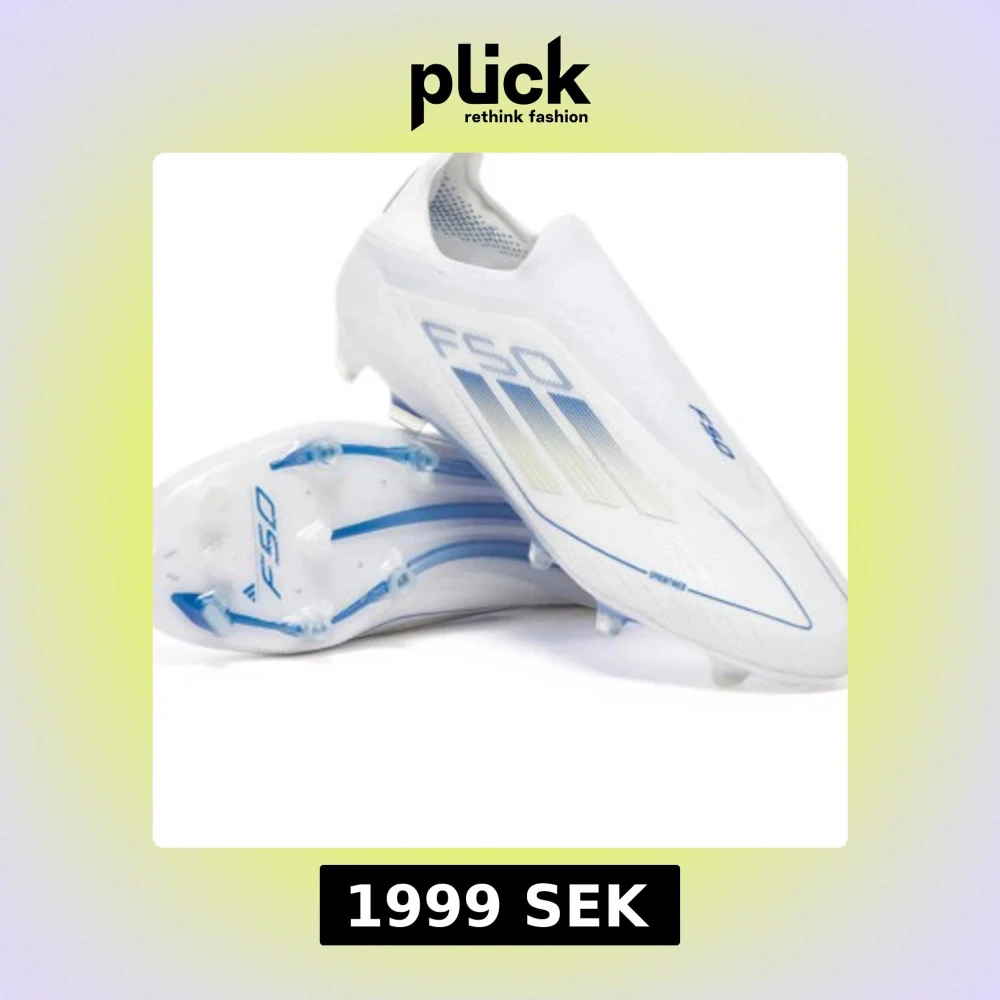 Säljer ett par Adidas F50 fotbollsskor i vitt med blå detaljer och transparent sula. Skorna har en strömlinjeformad design med integrerade dobbar för grymt grepp på planen. Lätta och snygga med diskret Adidas-logga och F50-tryck på sidan. Dem är storlek 4- men passar även 42