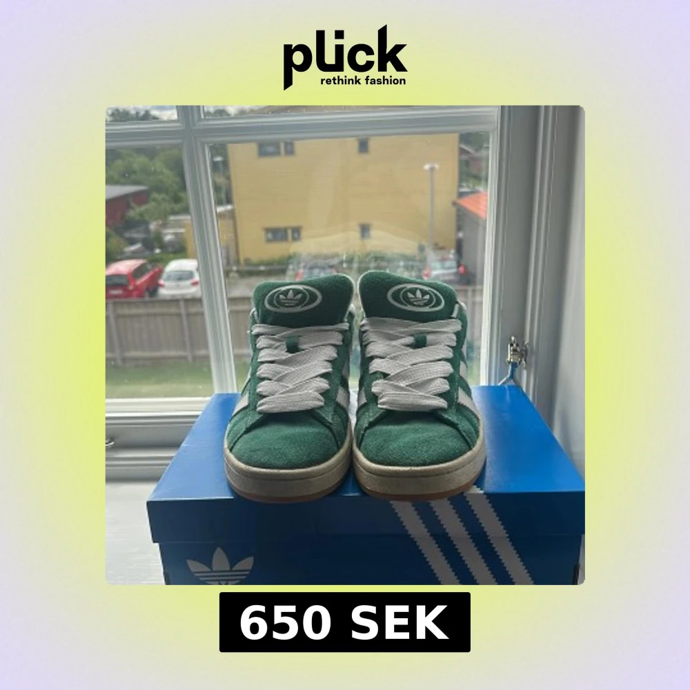 Säljer ett par gröna Adidas Campus sneakers med klassiska vita ränder och logga på tungan och hälen. Skorna har vit snörning, rund tå och platt sula. Ovandelen är i mjuk mocka och insidan är fodrad med textil. Perfekt för dig som gillar retrostil och streetwear.