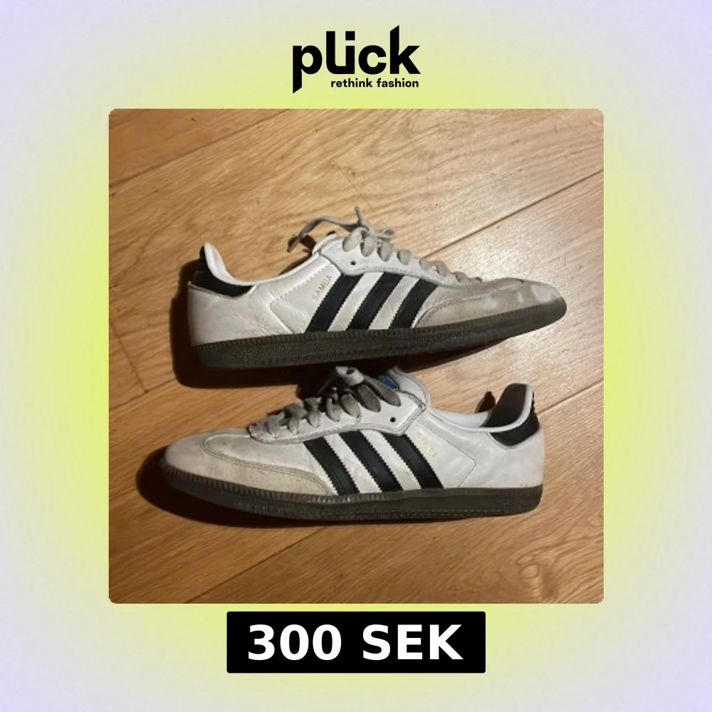 Klassiska Adidas Samba sneakers i vitt skinn med svarta detaljer och de ikoniska tre ränderna på sidorna. Låg modell med snörning och mörk gummisula. Perfekta för dig som gillar retrostil och streetwear.