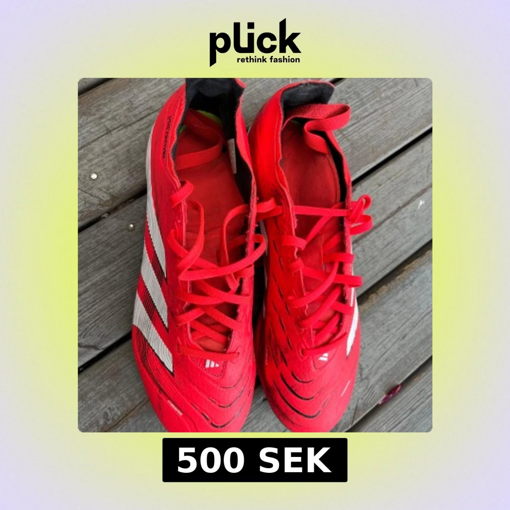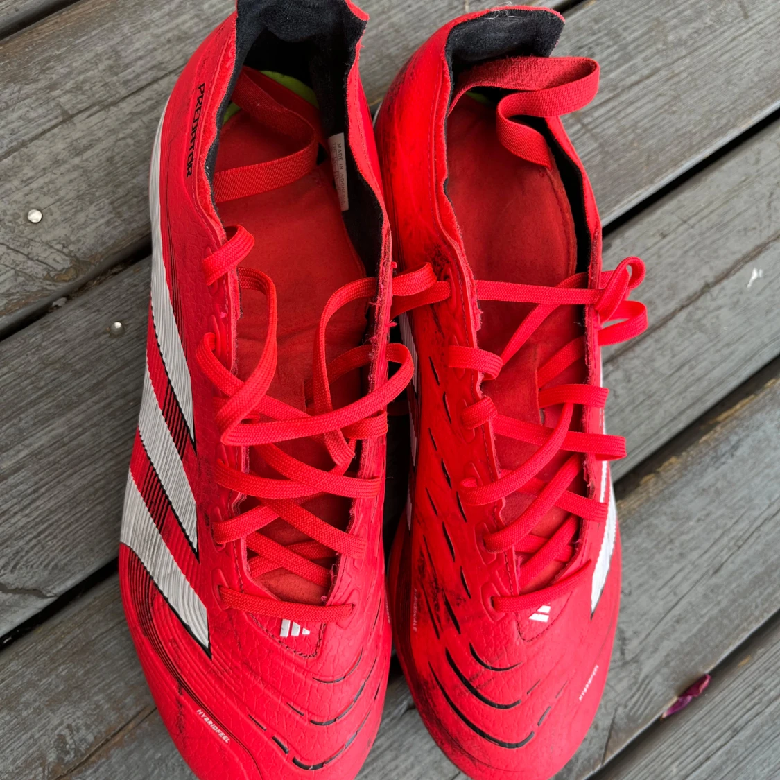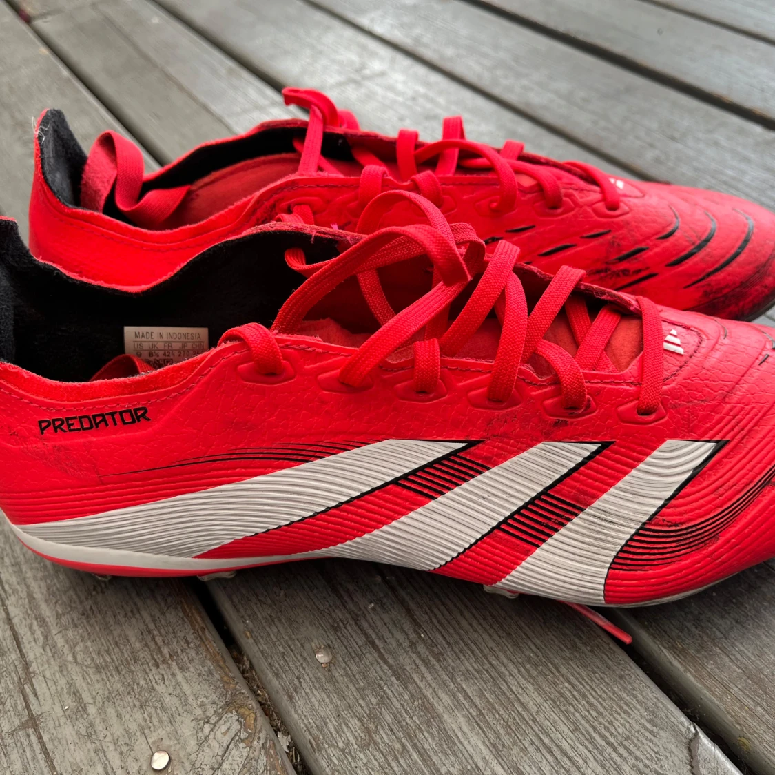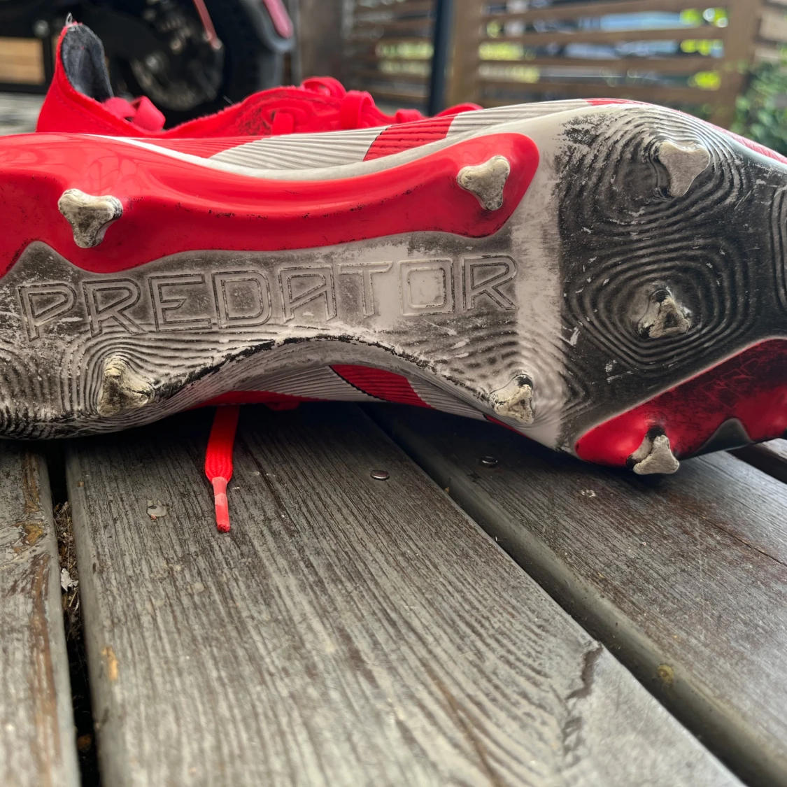 Säljer ett par röda Adidas Predator fotbollsskor med vita och svarta detaljer. Skorna har snörning och är tillverkade i syntetmaterial. De har klassiska tre ränder på sidan och dobbar under sulan för bra grepp på planen.