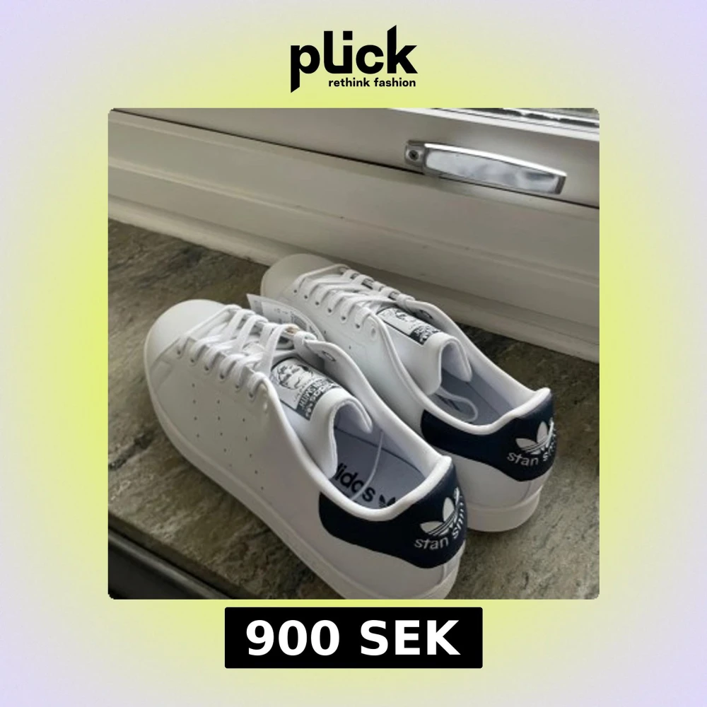 Klassiska Adidas Stan Smith sneakers i vitt med mörkblå detalj på hälen och perforerade ränder på sidorna. Skorna har rund tå, platt sula och snörning. Tillverkade i syntetmaterial med stilren och tidlös design. Perfekta för dig som gillar clean och sportig look. Går att diskutera priset.