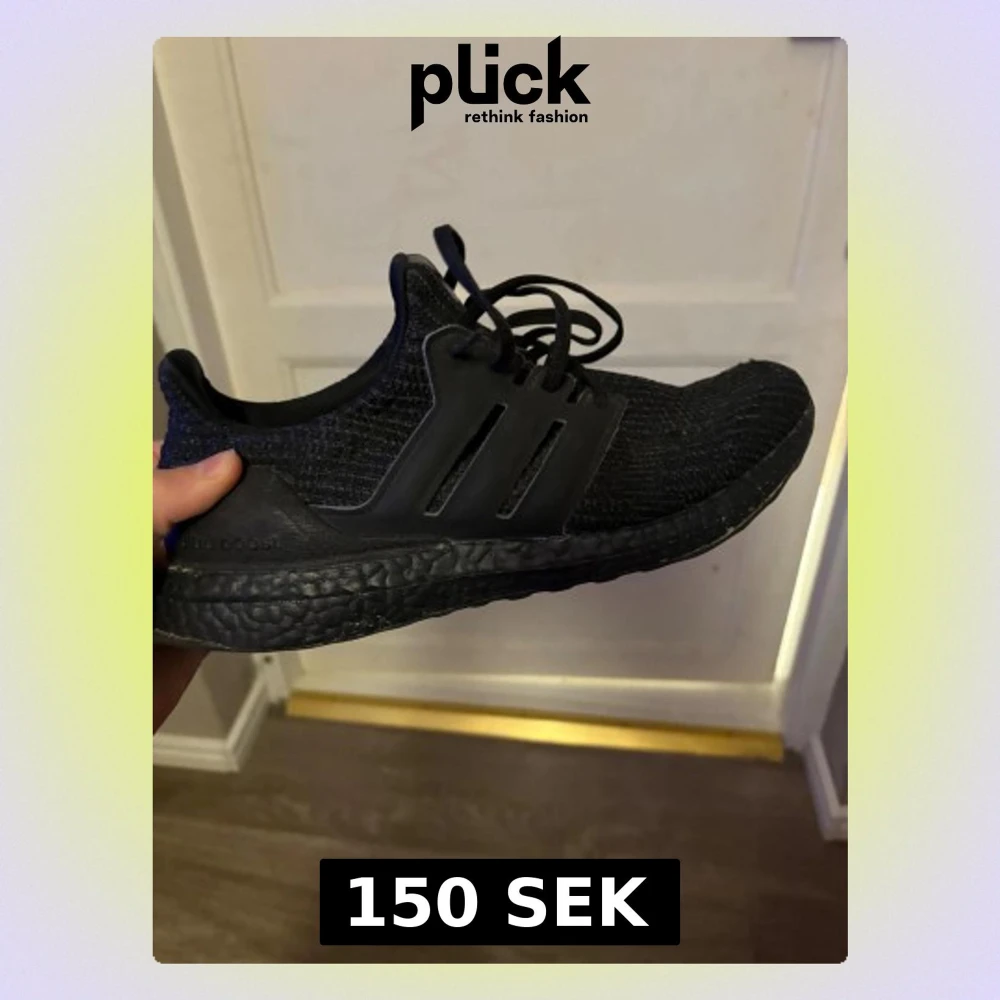 Säljer ett par svarta Adidas Ultraboost sneakers med stickad ovandel och platt sula. Skorna har snörning och den klassiska Boost-mellansulan för extra komfort. Snygg, sportig design med svarta detaljer och Adidas-logga på sidan.