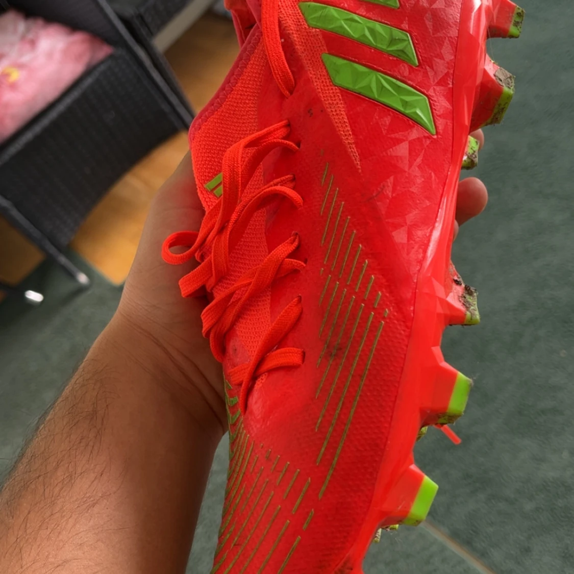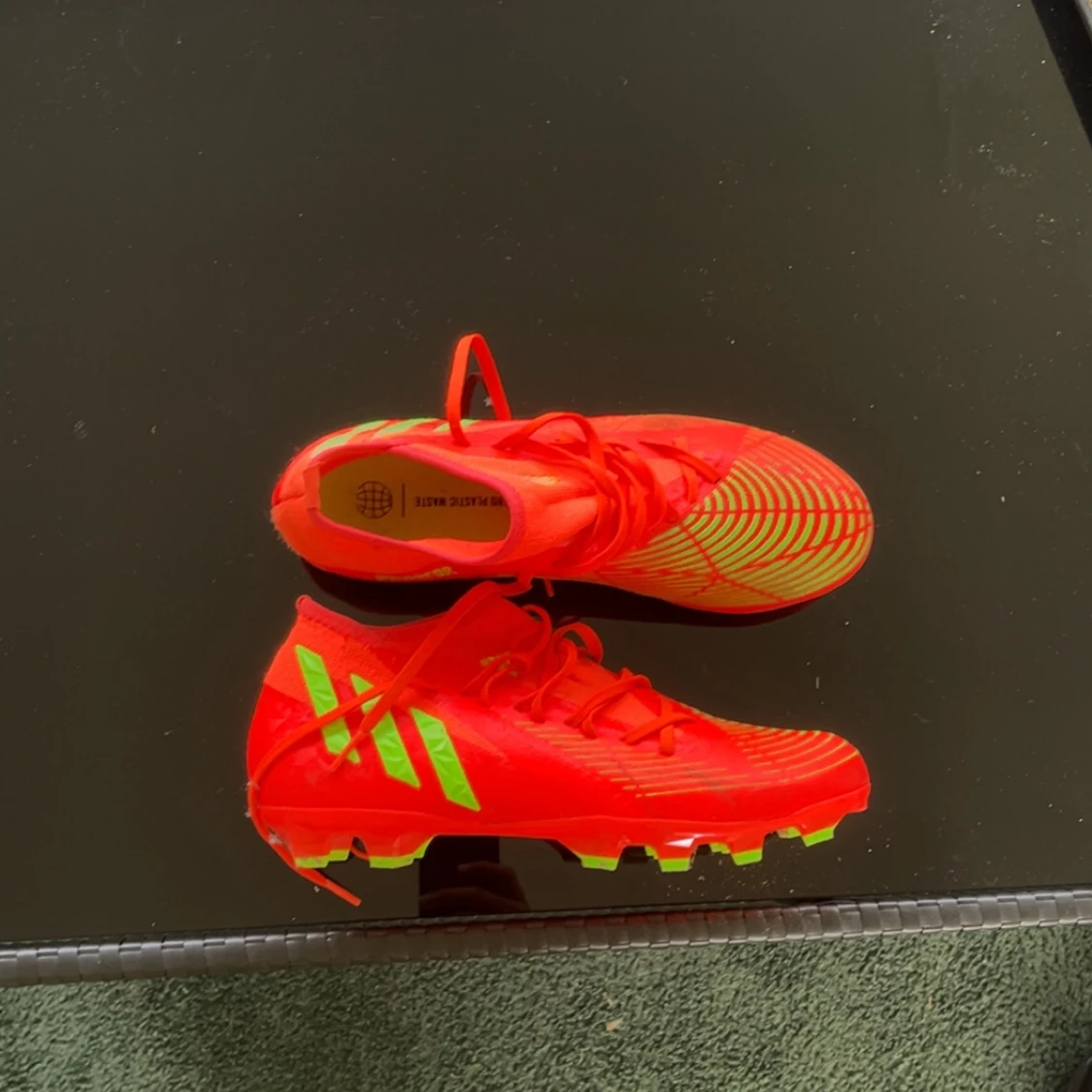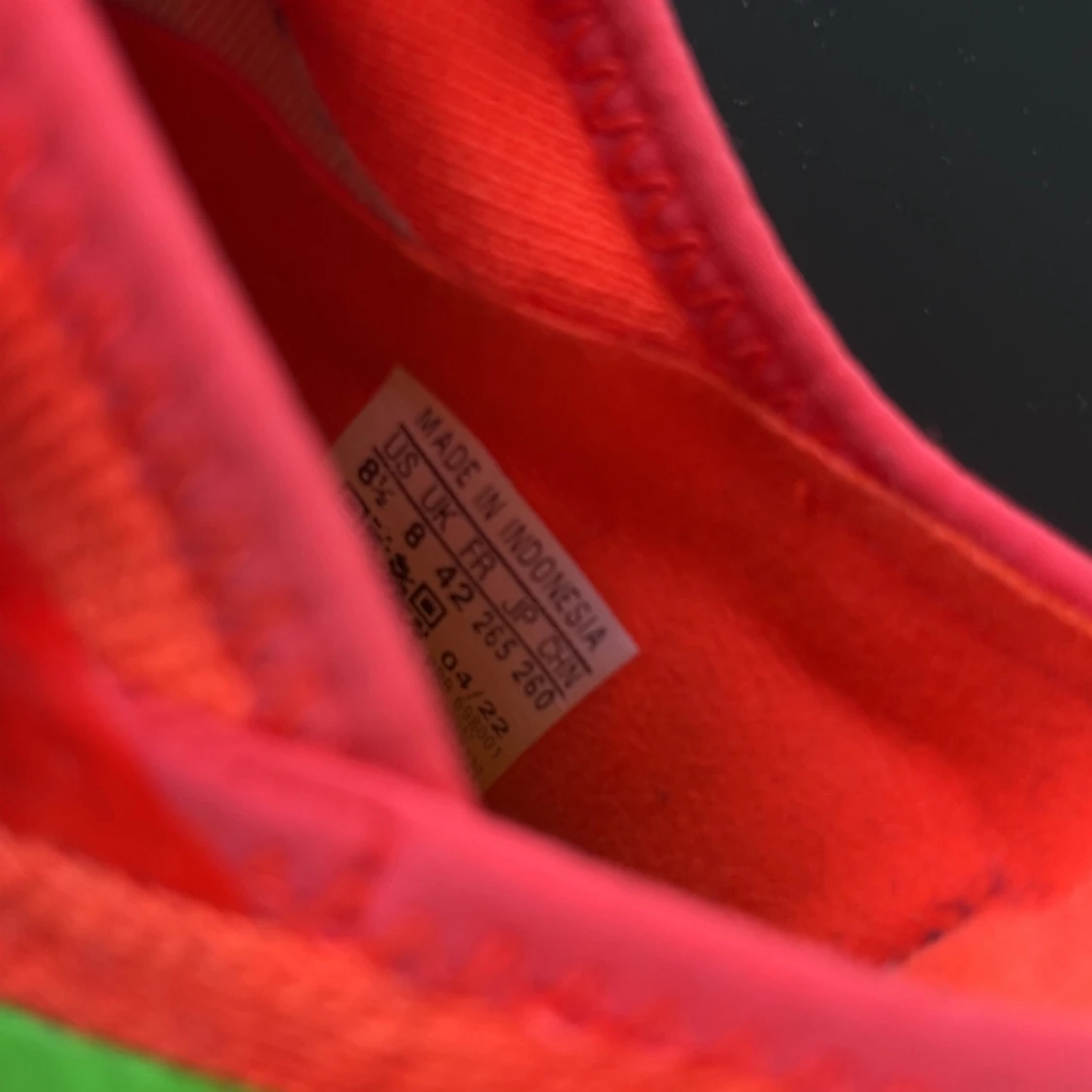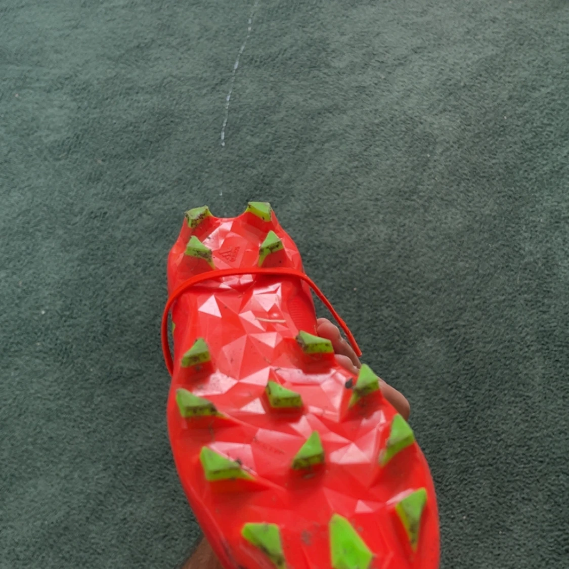 Säljer ett par grymma Adidas fotbollsskor i rött med gröna detaljer och mönstrad sula. Skorna har snörning och är tillverkade i syntetmaterial. Perfekta för dig som vill sticka ut på planen med en riktigt fet färgkombo och snygg design.