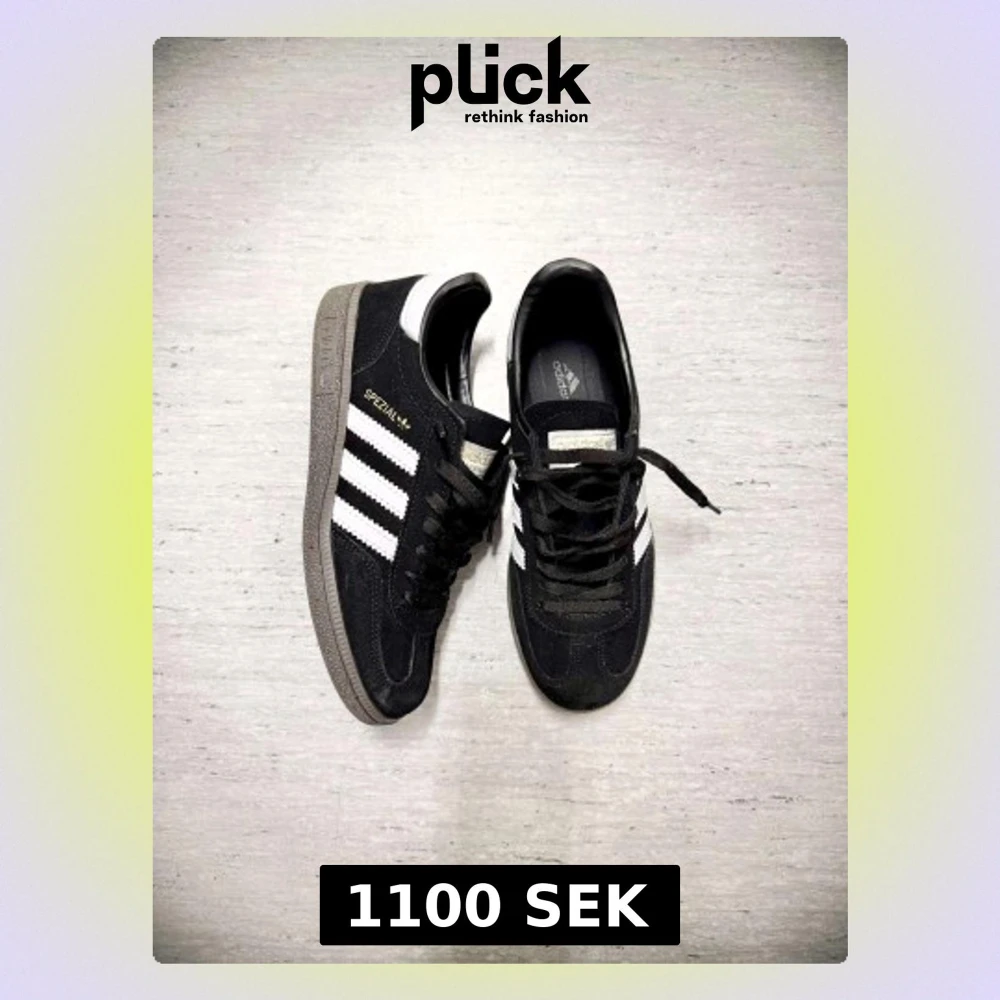 Svarta Adidas Spezial sneakers med klassiska vita ränder på sidorna och grå sula. Skorna har snörning och är tillverkade i mocka med detaljer i skinn. Rund tå och låg profil ger en clean och sportig vibe. Perfekta för dig som gillar retrostil och streetwear.