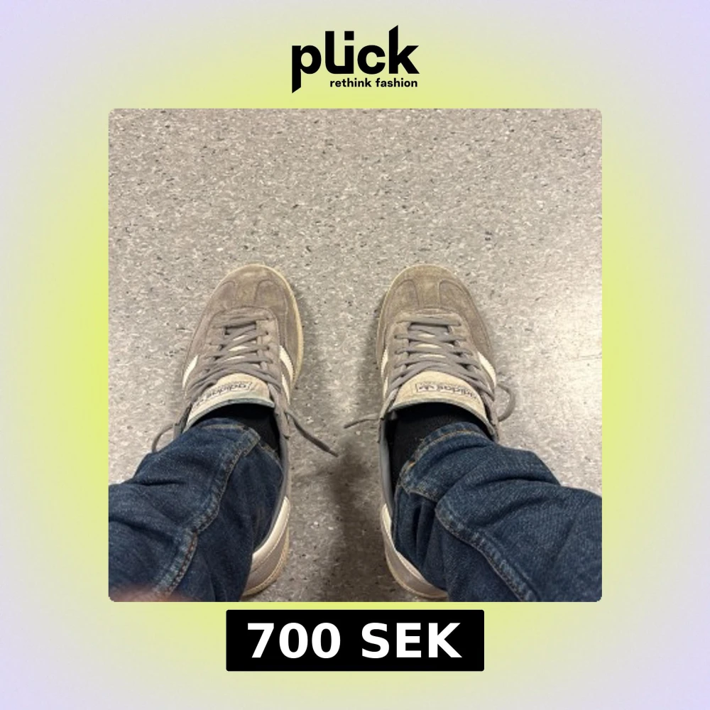 Säljer ett par klassiska grå Adidas Gazelle sneakers med vita detaljer och snörning. Skorna har en stilren design med den ikoniska tre-randiga looken på sidorna. Perfekta för en avslappnad stil.