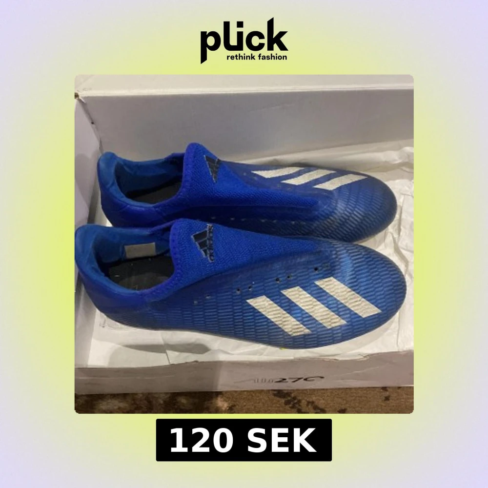 Snygga blå fotbollsskor från Adidas med vita ränder och en strömlinjeformad design. Skorna har en tight passform och är perfekta för snabba rörelser på planen. De har en låg profil och är utan snörning för en smidig känsla.