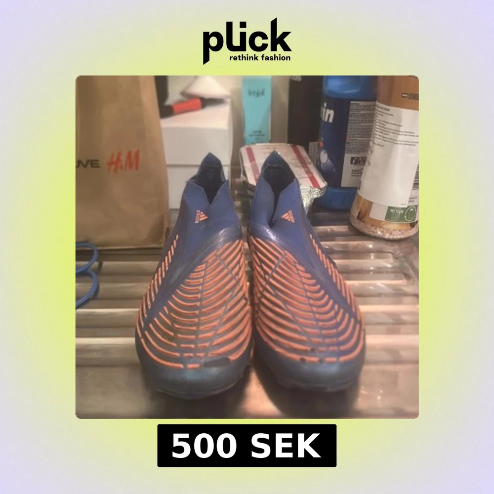 Snygga blå fotbollsskor från Adidas med orangea detaljer. Skorna har en strömlinjeformad design utan snörning och är perfekta för spel på gräs. De har en rund tå och är tillverkade i syntetmaterial för optimal prestanda.