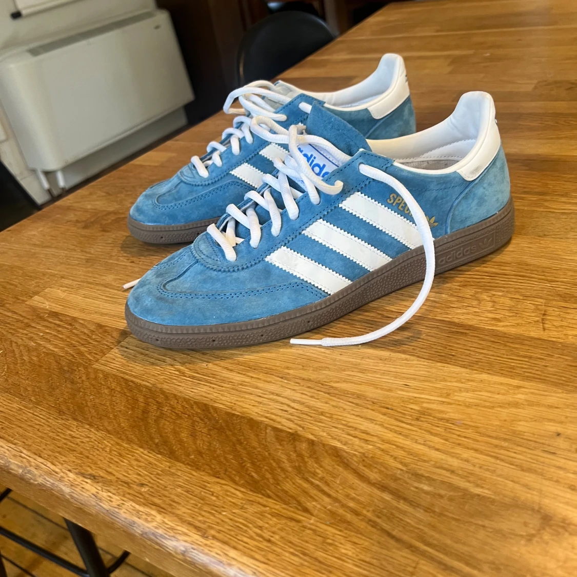 Säljer ett par Adidas Spezial sneakers i blå mocka med vita detaljer och klassiska tre ränder på sidorna. Skorna har vit hälkappa, vita skosnören och brun sula. Guldtexten 'Spezial' syns på sidan. Perfekta för dig som gillar retrostil och streetwear.