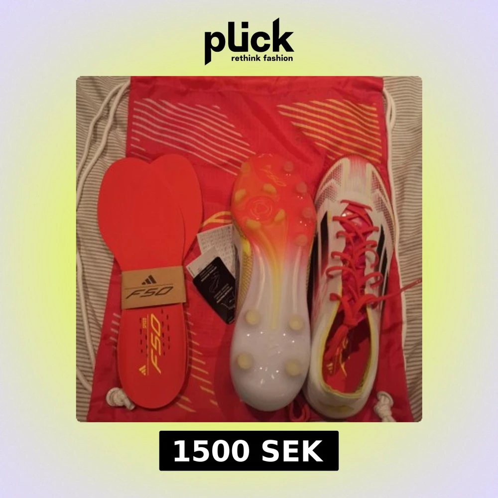 Säljer ett par Adidas F50 Elite fotbollsskor i vitt med röda och svarta detaljer. Skorna har snörning, platt sula med dobbar och levereras med extra innersulor och en matchande röd påse. Perfekta för dig som vill sticka ut på planen!