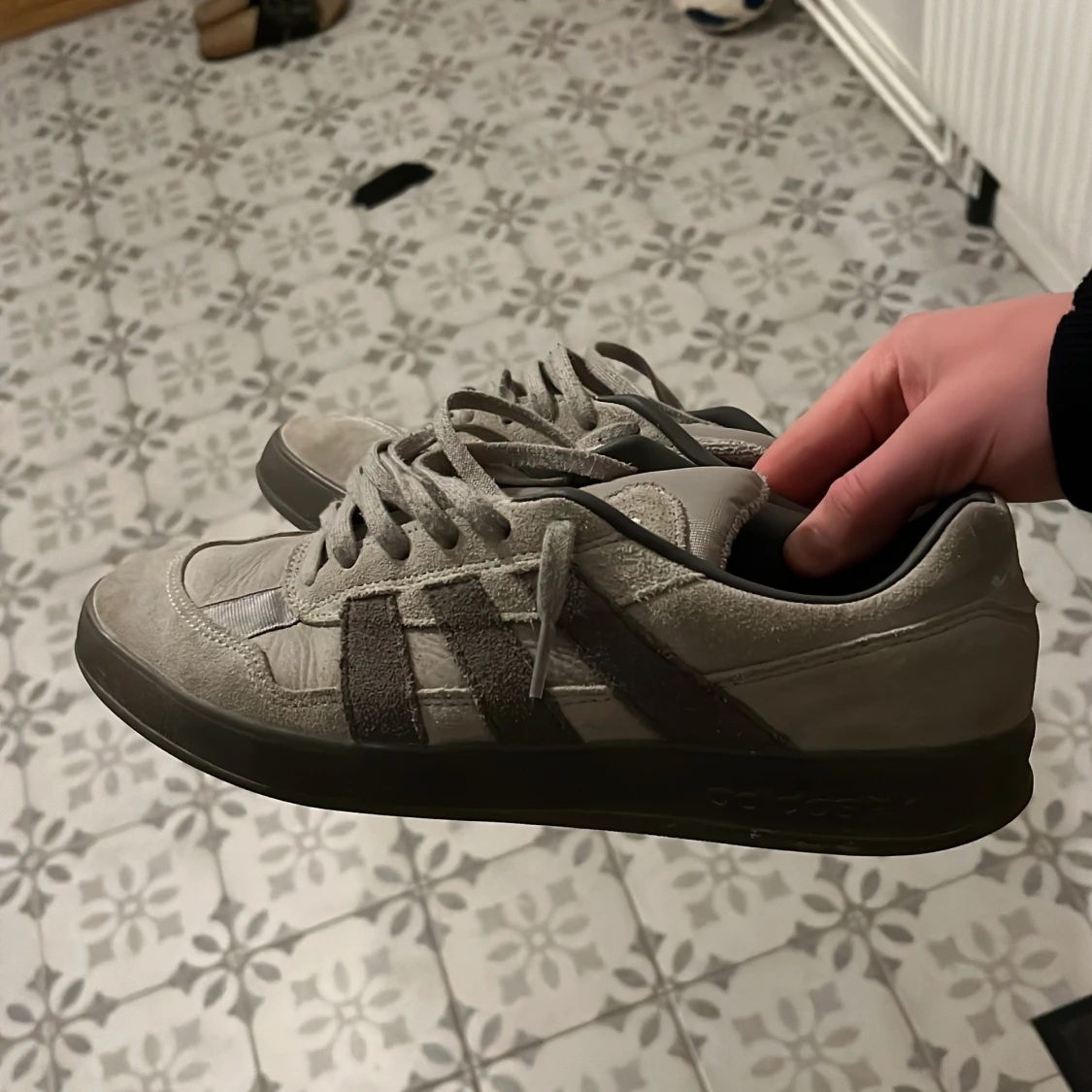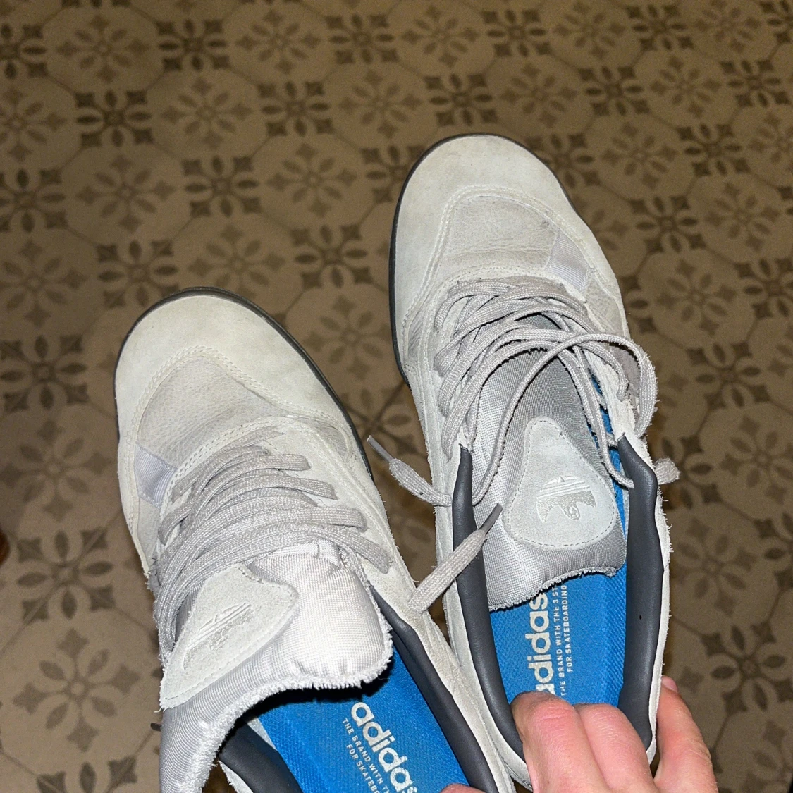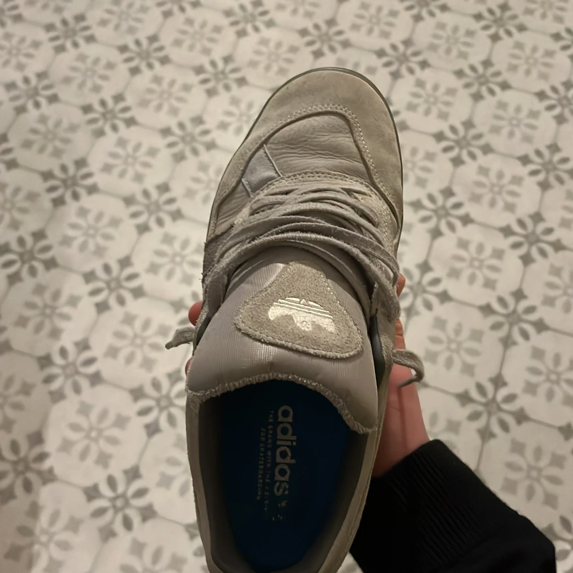 Säljer ett par stilrena Adidas alhoa sneakers i grå mocka med klassiska ränder på sidan och broderad detalj på hälen. Skorna har snörning, platt sula och rund tå. Perfekta för dig som gillar en clean och enkel look med snygga detaljer.
