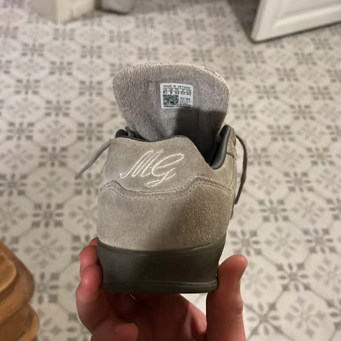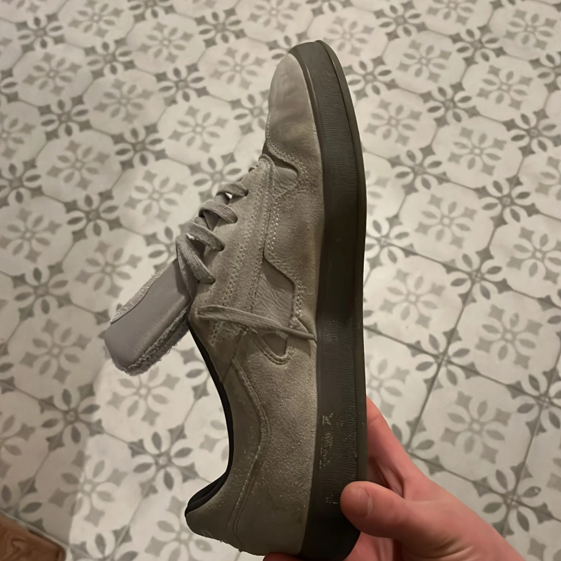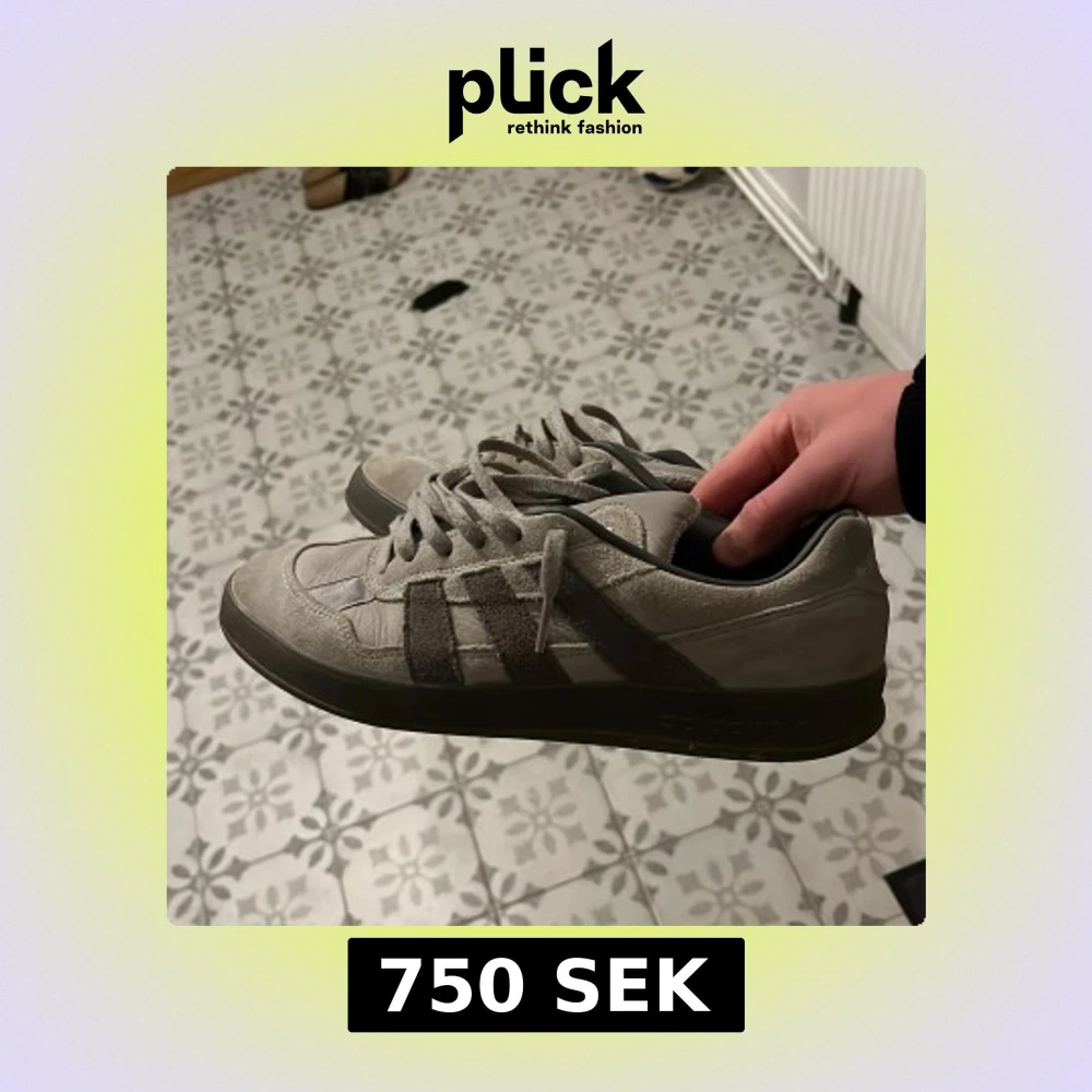 Säljer ett par stilrena Adidas alhoa sneakers i grå mocka med klassiska ränder på sidan och broderad detalj på hälen. Skorna har snörning, platt sula och rund tå. Perfekta för dig som gillar en clean och enkel look med snygga detaljer.