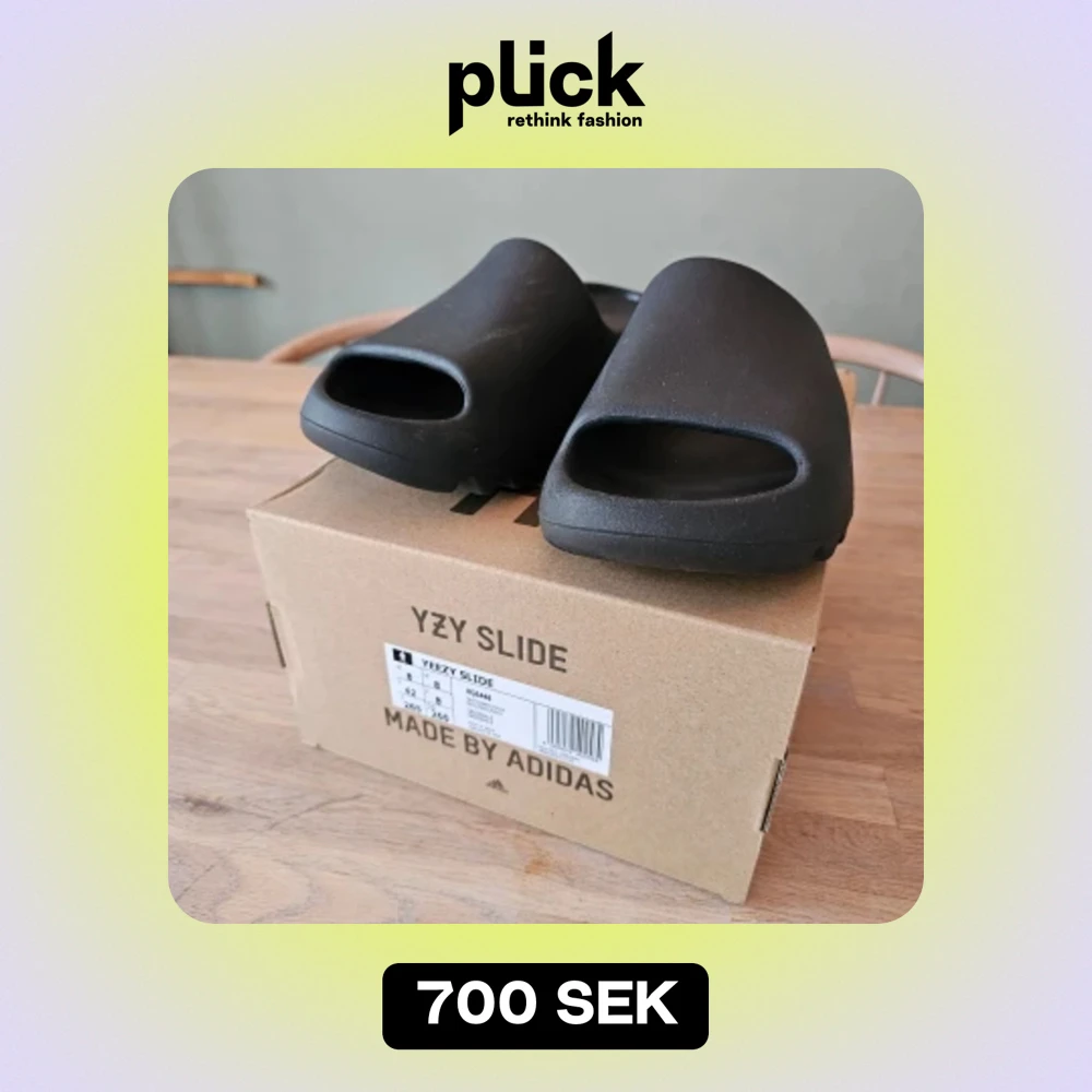 Yeezy slides, svarta, inköpta förra sommaren. Bra skick(enligt bilder). Kvitto och låda medföljer. Storleken är liten så passar mer 41 än 42, men storleken är 42 enligt låda.