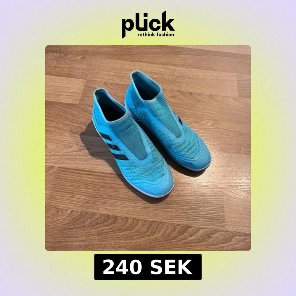 Säljer ett par Adidas Predator fotbollsskor i en fräsch ljusblå färg med svarta ränder på sidorna. Skorna har en strumpliknande passform utan snörning och en mönstrad sula för bra grepp på planen. Perfekta för dig som vill sticka ut på futsal eller inomhusfotboll.