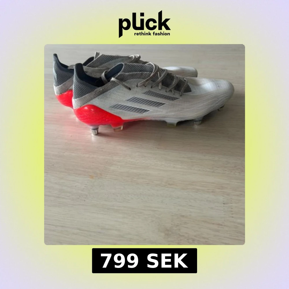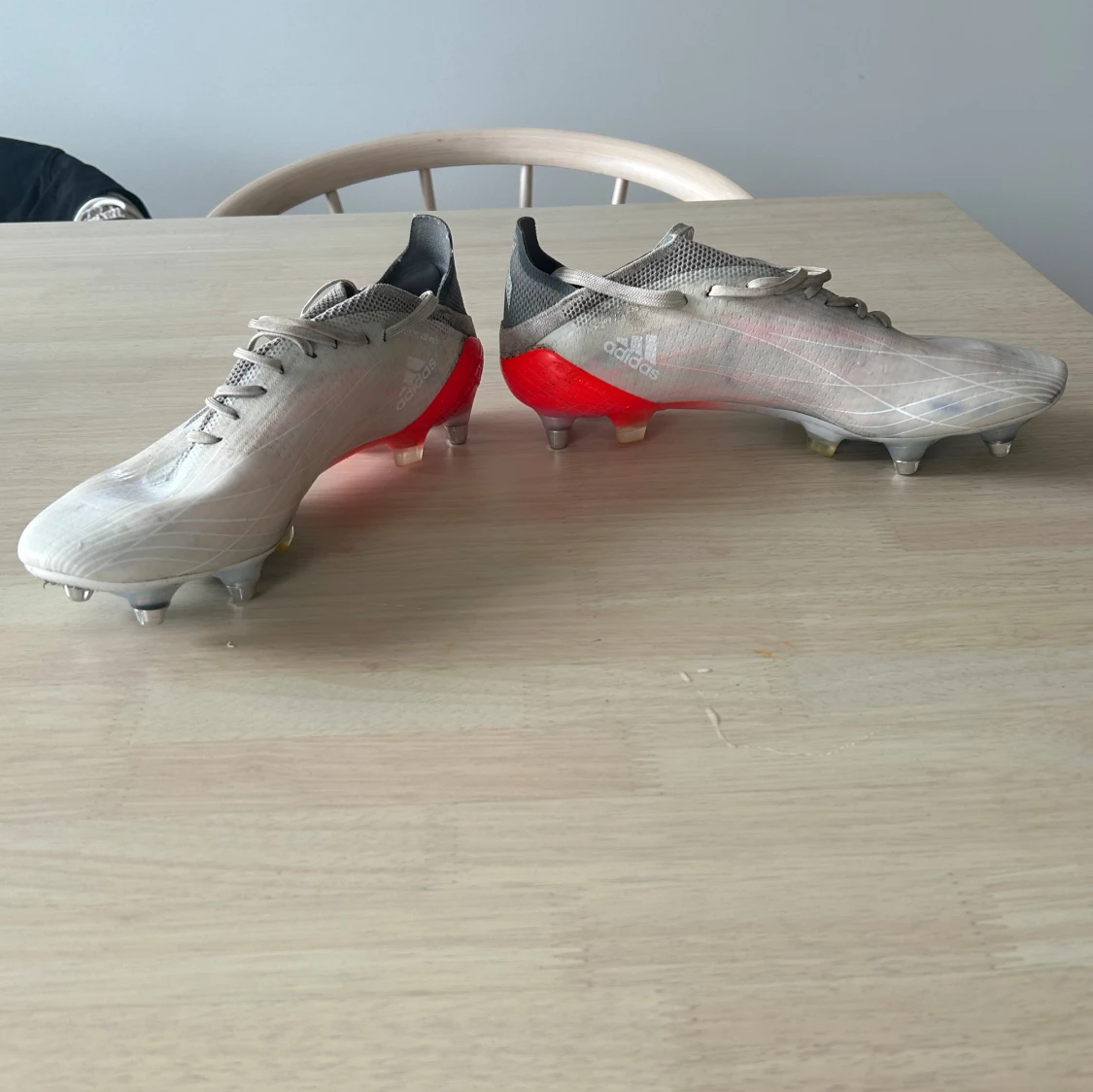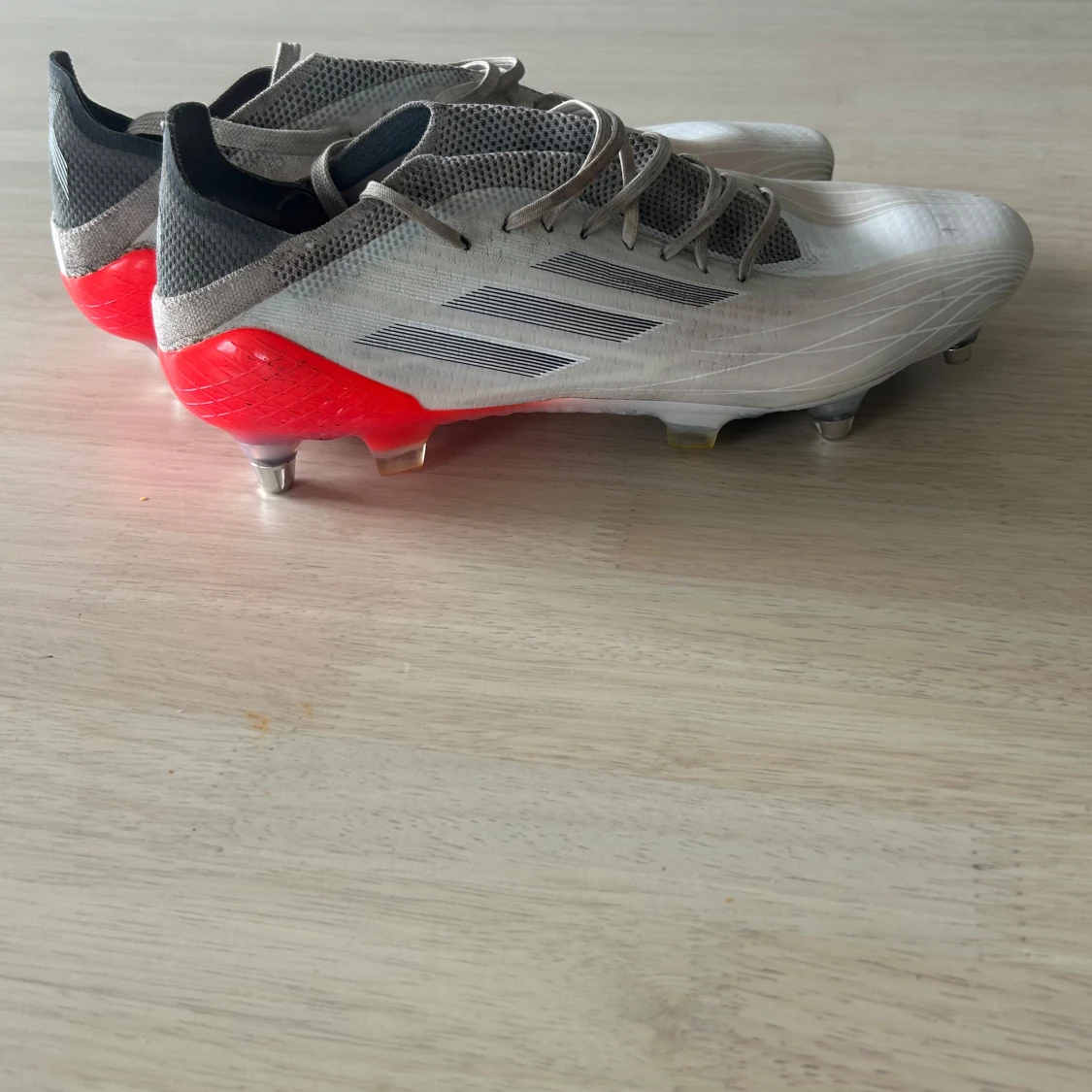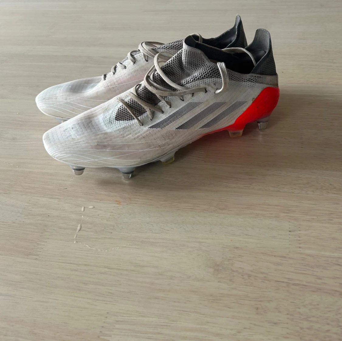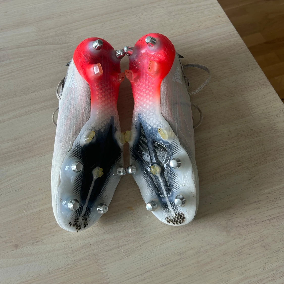 Säljer ett par Adidas fotbollsskor med snygg design i vitt och rött. Skorna har metall-dobbar, snörning och en strömlinjeformad siluett med mesh-överdel för bra ventilation. De har svarta och grå detaljer samt klassiska Adidas-ränder på sidan. Perfekt för dig som vill ha grymt grepp på planen.