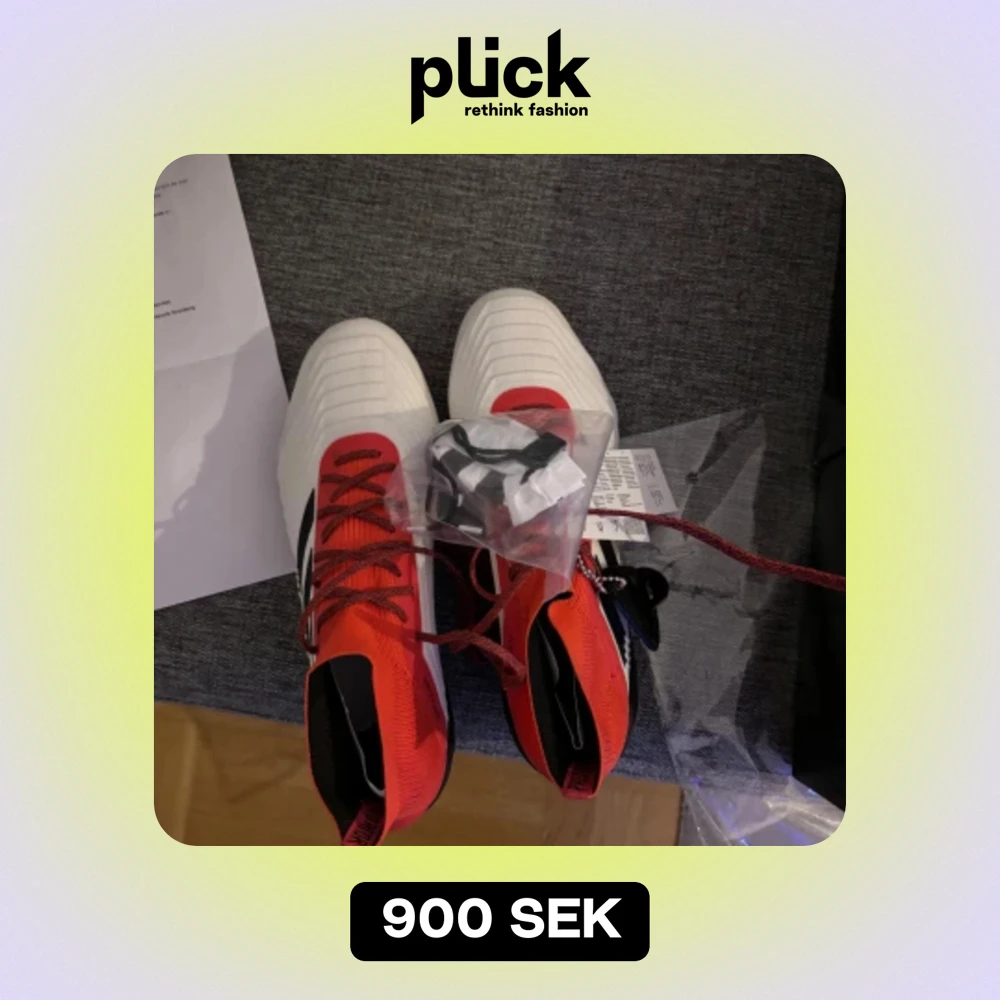 Säljer ett par snygga fotbollsskor i röd och vit färg med svarta detaljer. Skorna har snörning och är utrustade med dobbar för bra grepp på planen. Perfekta för fotbollsträning eller match!
