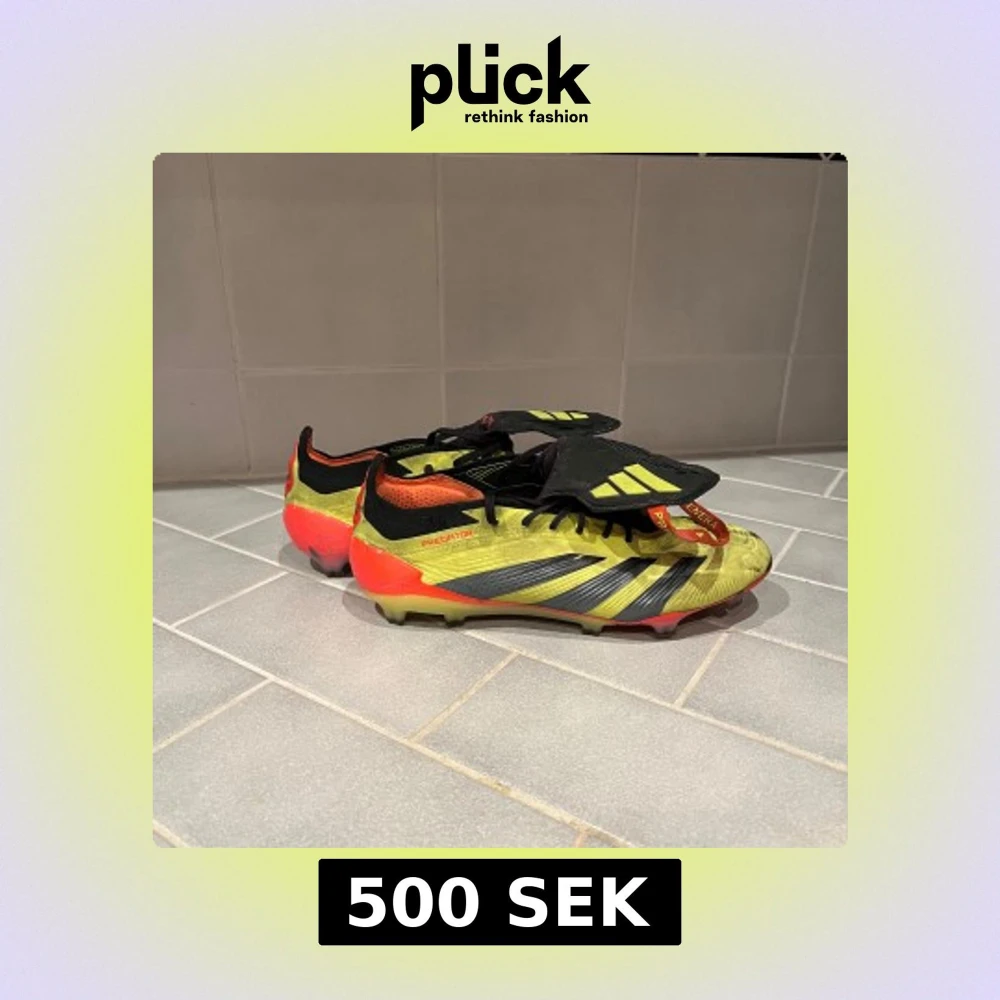 Säljer ett par Adidas Predator fotbollsskor i en cool gul och röd färg med svarta detaljer. Skorna har snörning och en låg profil, perfekt för dig som vill ha bra grepp och kontroll på planen. Snygg design med klassiska Predator-detaljer. Skada på skon, se bilder.