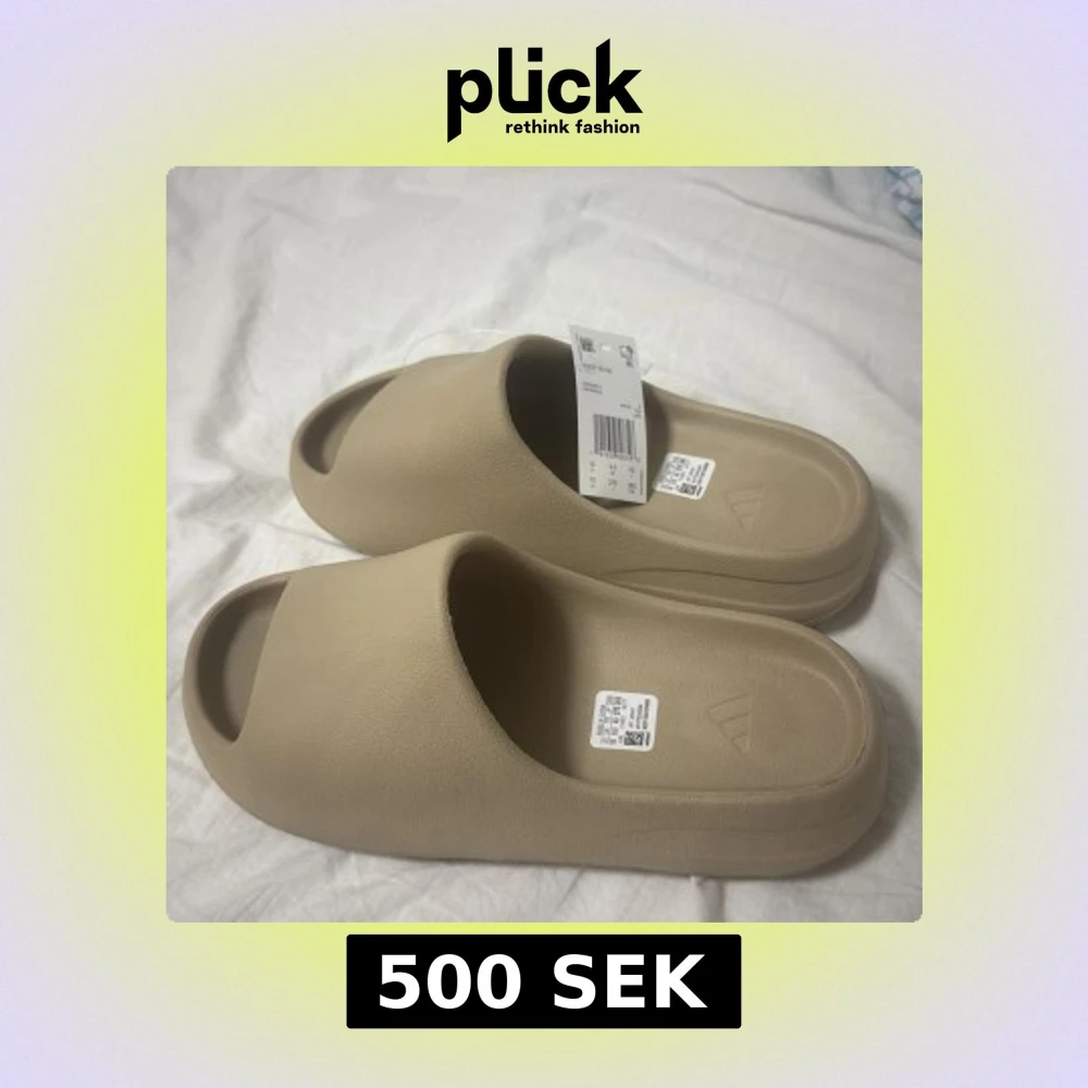 Säljer ett par beige adidas Yeezy Slide sandaler med chunky, vågformad sula och öppen tå. De är tillverkade i syntetmaterial och har en minimalistisk design med adidas-logga på fotbädden. Perfekta för chill dagar eller när du vill ha en clean look.