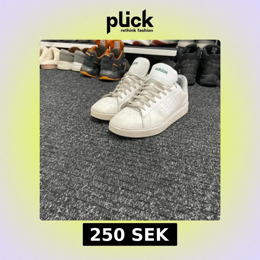 Säljer ett par klassiska vita Adidas sneakers med gröna detaljer. Skorna har snörning och en stilren design som passar till många olika stilar. Dom är i storlek 43 och är otroligt sköna att gå i men säljer dom nu för har köpt ett par nya då dom gamla inte passade min stil