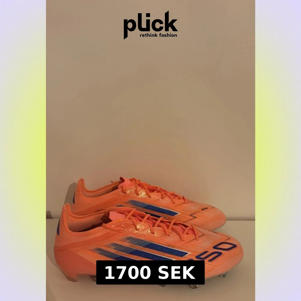 Säljer ett par Adidas F50 fotbollsskor i en riktigt orange färg med blå detaljer och vita linjer. Skorna har snörning, platt sula med dobbar och en smal, aerodynamisk form. Tillverkade i syntetmaterial för lätt känsla och maxad speed på planen.