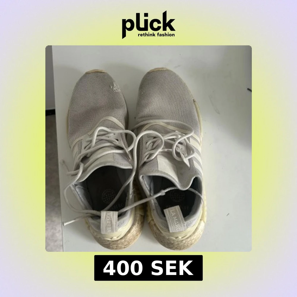 Säljer ett par Adidas NMD R1 sneakers i ljusgrått med vita detaljer och klassiska tre ränder på sidan. Skorna har snörning, platt sula och är tillverkade i syntetmaterial och textil. Perfekta för en sportig och stilren look.