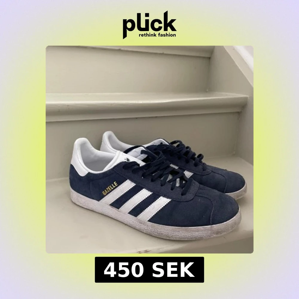 Säljer ett par klassiska Adidas Gazelle sneakers i mörkblå mocka med vita detaljer och de ikoniska tre ränderna på sidorna. Skorna har snörning och vit platt sula. Perfekta för en stilren och sportig look.