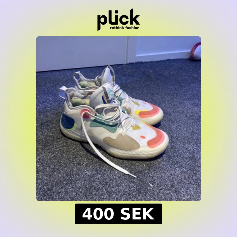 Säljer ett par unika sneakers med en färgglad design i vitt, blått, grönt, gult och rosa. Skorna har snörning och en bekväm sula med färgglada detaljer. Perfekta för dig som vill sticka ut!