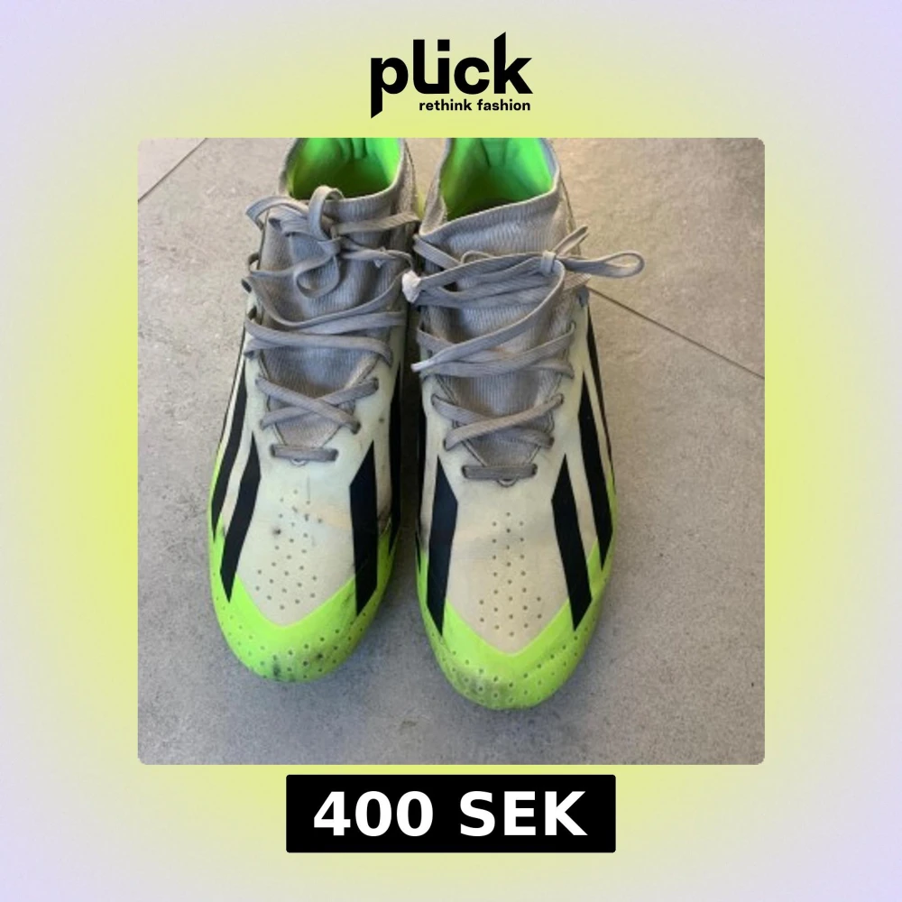 Säljer ett par Adidas fotbollsskor i vitt med neongula och svarta detaljer. Skorna har snörning och en låg profil, perfekt för snabba rörelser på planen. Insidan är fodrad i neongrönt och ovandelen har klassiska svarta ränder.