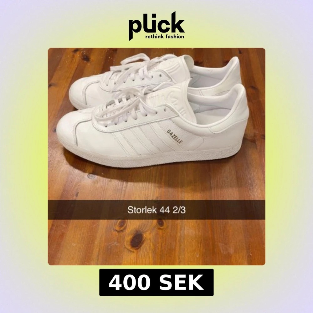 Säljer ett par fräscha vita Adidas Gazelle sneakers i skinn med klassiska tre ränder på sidan och guldfärgad Gazelle-text. Stilren och tidlös modell med snörning och platt sula. Perfekta för dig som gillar clean och sportig stil.