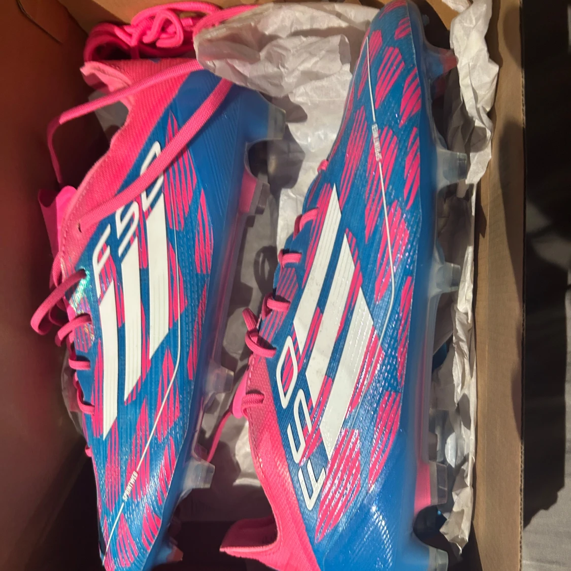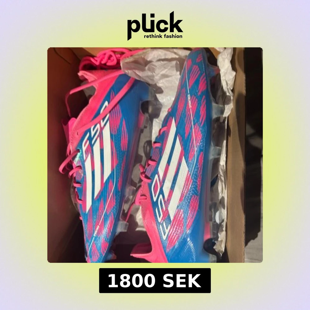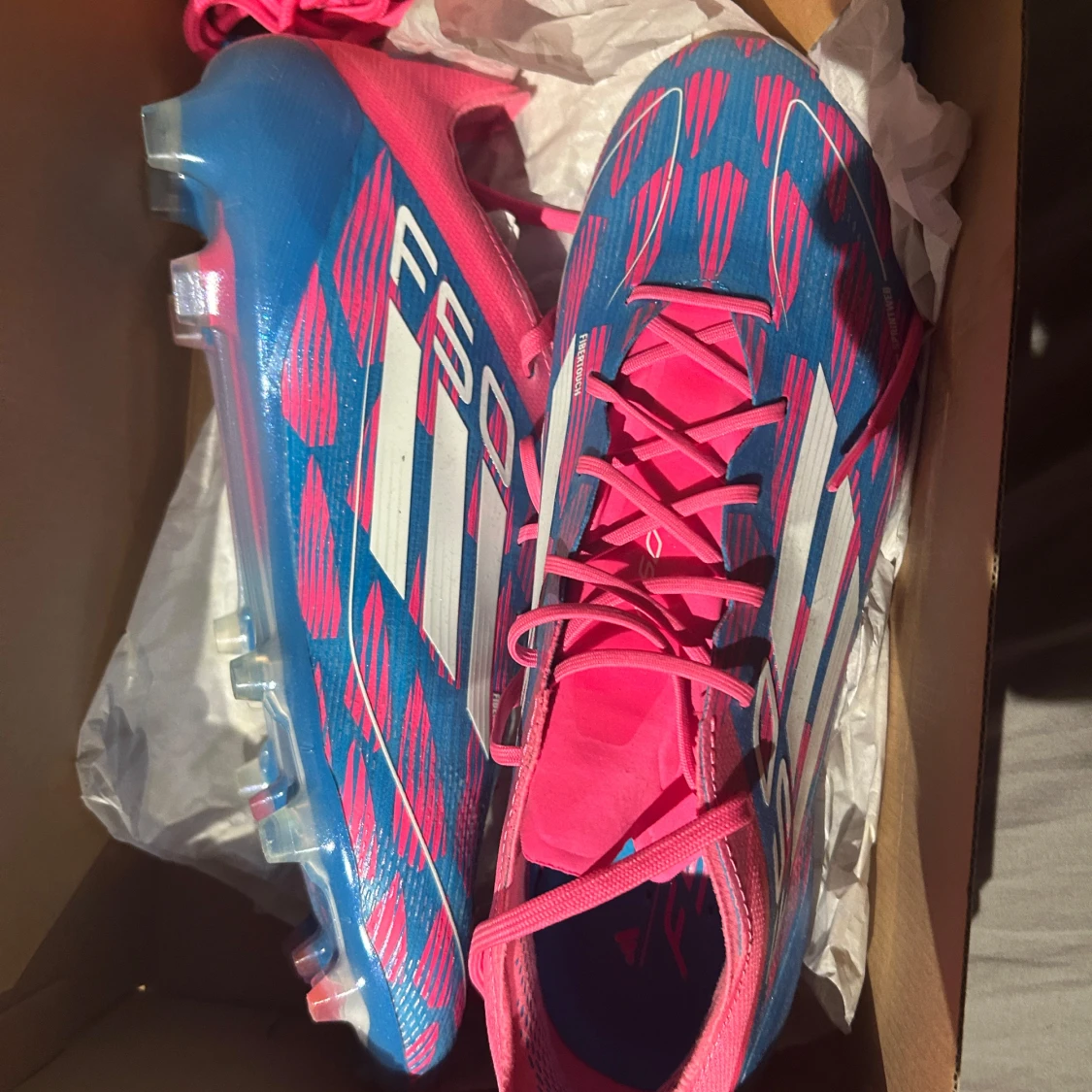 Snygga Adidas F50 fotbollsskor i blått och rosa med vita detaljer och klassiska ränder storlek 44. Helt nya, aldrig använda, säljer för att de inte passar. Fraktar samma dag. FG