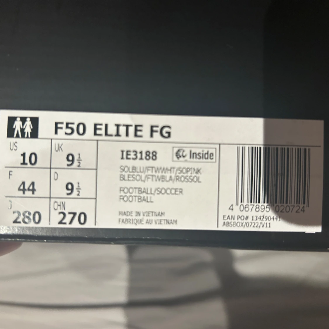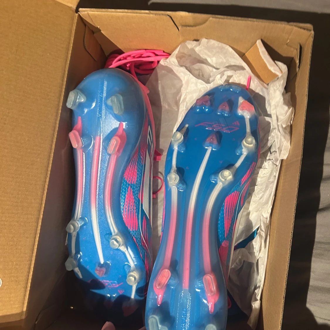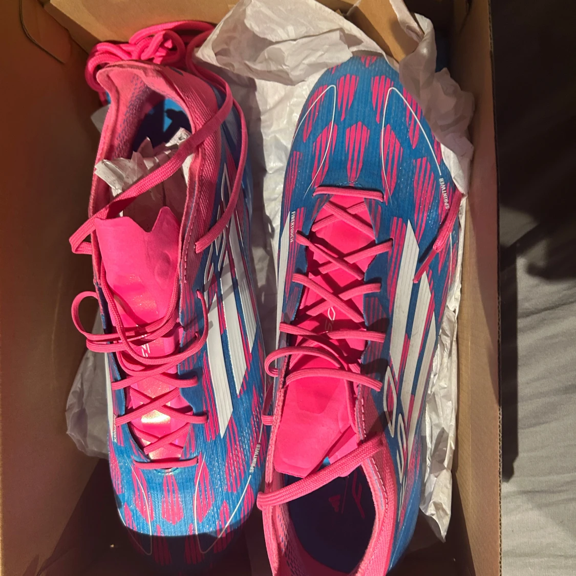 Snygga Adidas F50 fotbollsskor i blått och rosa med vita detaljer och klassiska ränder storlek 44. Helt nya, aldrig använda, säljer för att de inte passar. Fraktar samma dag. FG